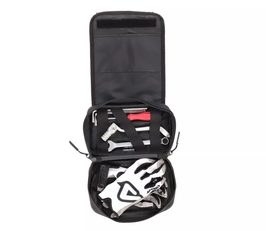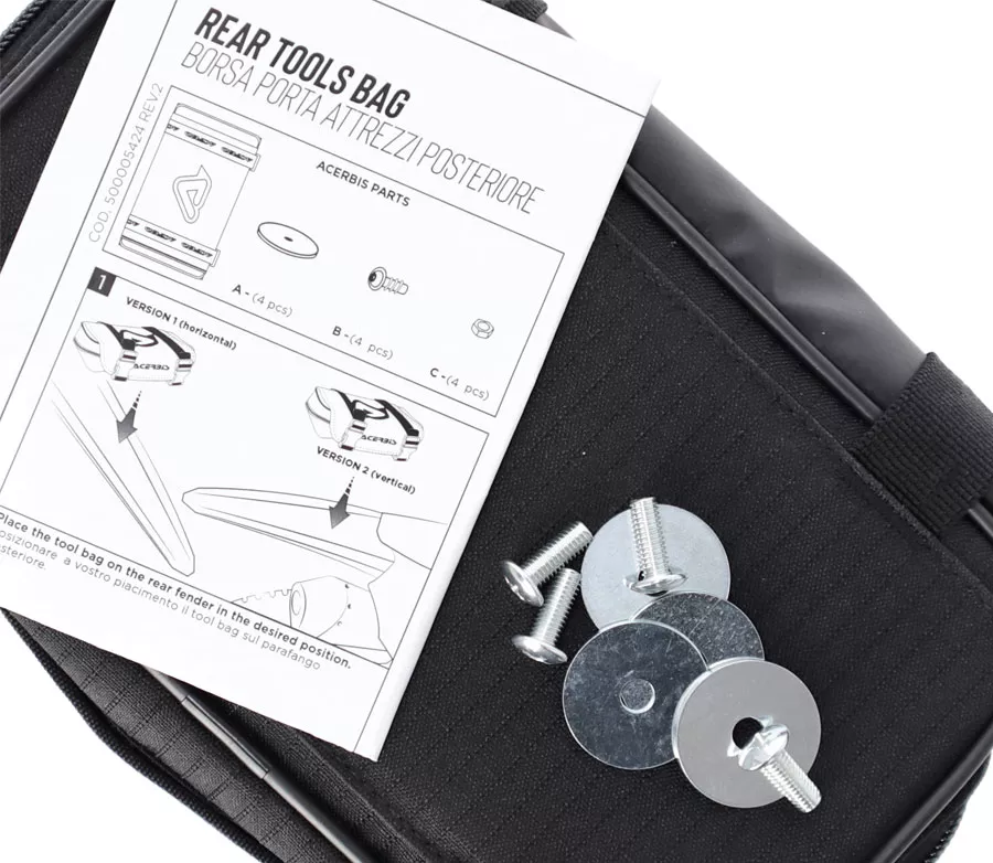 - Praktická a kompaktní brašna na nářadí, která se připevňuje na zadní blatník pomocí čtyř šroubů (součást balení). - Vnější pogumovaná tkanina pro snadné čištění vlhkou houbou a zvýšenou odolnost proti vodě. - Trojitý uzavírací systém: SBS zip, suchý zip a přezky. - Vnitřní kapsa na nářadí a malá vnější kapsa s průhledným dnem. - Kapacita: 2 litry. - Rozměry: 230 × 140 mm.