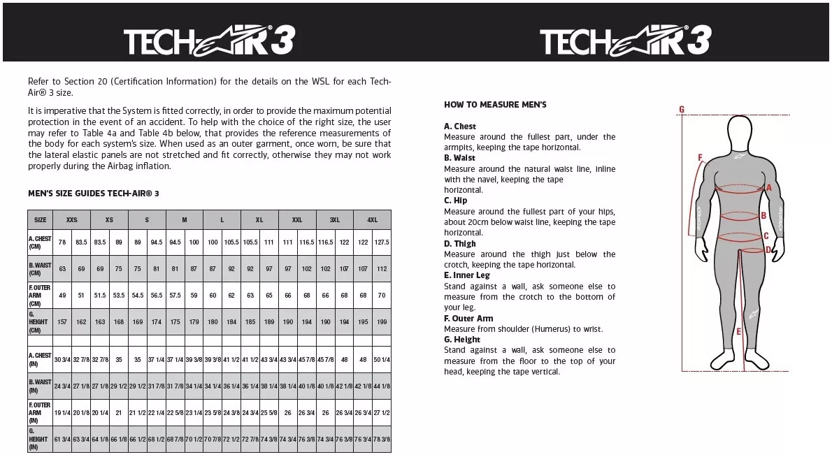 (cm)79-83 83-87 87-91 91–95 95–99 99-103 103–107 107-111 111–115 115–119 119–123 123–127 127-131 D. Stehno (cm) 48–49 50 - 51 52 - 53 54–55 56-57 58–59 60-61 62-63 64–65 66-67 68-69 70-71 72-73 E. Vnitřní šev (cm) 71-72 73-74 75-76 77-78 79-80 81-82 83-84 85-86 87-88 89-90 89-90 91-92 91-92 F. Vnější rameno (cm) 49–50 51-52 53–54 55–56 57-58 59 - 60 61-62 63-64 65-66 67-68 67-68 69-70 69-70 G. Výška (cm) 150–156 157-163 164–167 168-171 172–175 176–179 180–183 184–187 188–191 192–195 192–195 196–199 196–199 Pánské velikosti bot ALPINESTARS