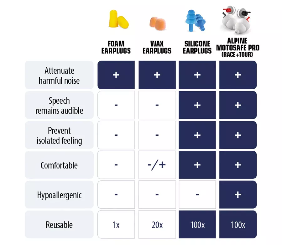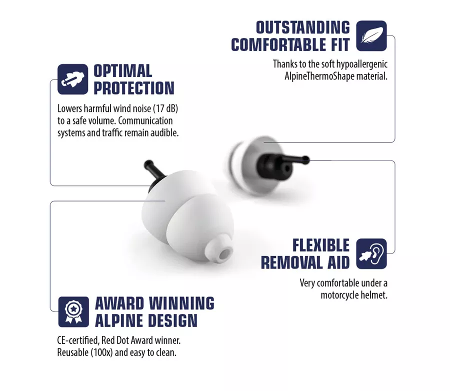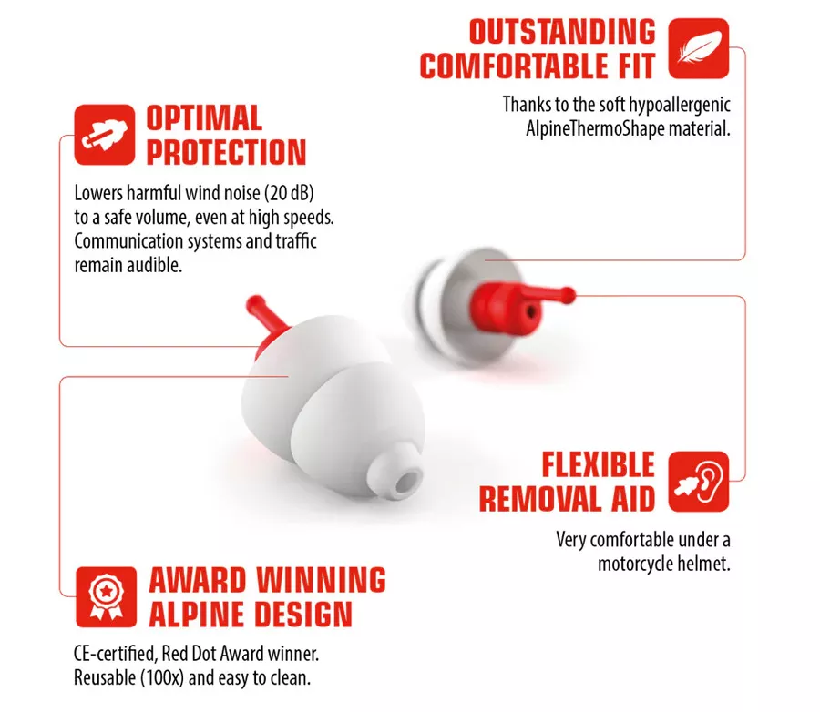 MotoSafe špunty do uší zmírňují škodlivé zvuky okolí, aniž byste měli pocit izolace od okolního dění. Např. zvuk navigace, mobilního telefonu nebo samotného motocyklu je dobře slyšitelný díky inovativním akustickým filtrům Alpine Acoustic Filtres ™.
