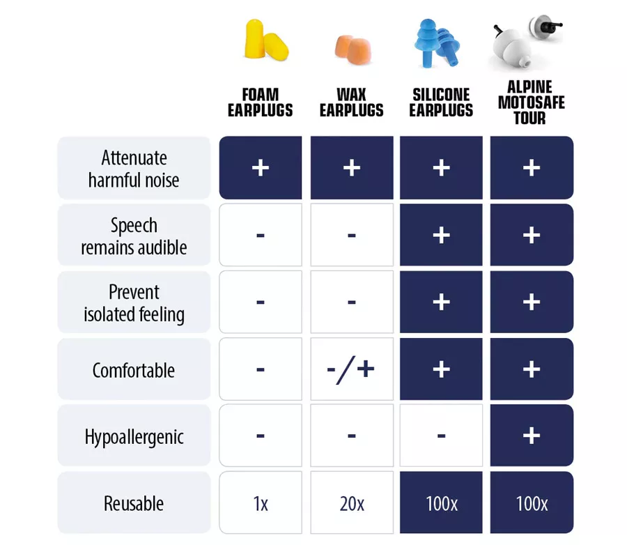 MotoSafe špunty do uší zmírňují škodlivé zvuky okolí, aniž byste měli pocit izolace od okolního dění. Např. zvuk navigace, mobilního telefonu nebo samotného motocyklu je dobře slyšitelný díky inovativním akustickým filtrům Alpine Acoustic Filtres ™. Ušní ucpávky mají velmi jemné filtry, jejich používání je komfortní, pod helmou netlačí a perfektně padnou. Alpine MotoSafe® je k dispozici v různých variantách s ochranou přizpůsobenou potřebám motorkáře. ideální na projížďky, dovolenkové vyjížďky, jízdu po dálnici Alpine MotoSafe® špunty do uší jsou vyrobeny z odolného a flexibilního materiálu AlpineThermoShape™. Díky tělesné teplotě uvnitř ucha je měkký materiál tvarován podle tvaru zvukovodu pro dokonalé padnutí. V kombinaci s měkkými filtry se špunty do uší dokonale hodí pod helmu, nikde netlačí. Materiál. AlpineThermoShape™ neobsahuje silikon, tudíž špunty nezpůsobují zapocení, svědění nebo podráždění pokožky. Špunty Alpine MotoSafe® můžete snadno používat celý den.