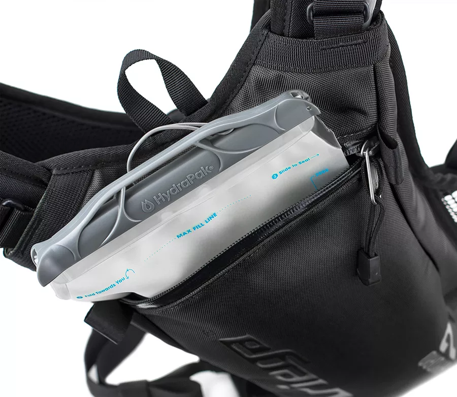 lehký závodní batoh s 2l nádobkou na vodu Hydrapack® Shape Shift™ Kriega Quadlock-lite™ postroj s 420D Cordura® materiálem pro vysokou odolnost rovnoměrný přenos zátěže z ramen během jízdy díky speciálnímu Quadlock-lite™ postroji pro volnost pohybu paží DVOULITROVÁ NÁDOBKA Shape-Shift™ zavírací přepážka pro úzký profil a vylepšenou stabilitu. Možnost objemu 2l pro plnou kapacitu nebo 1,5l při zavření Slide-Seal™ vrchní široké rozevření a těsné zavření pro vodotěsnost High-flow Blaster™ samouzavírací ventil na hadičce proti zabránění unikání vody Plug-N-Play™ spojovací systém umožňuje jednoduše odpojit napájecí hadičku (automaticky uzavíratelný ventilek zabrání odkapávání) a odejmout nádobku z batohu pro pohodlné doplnění nádobka je oboustranná pro snadné čištění a vysoušení, vhodná pro mytí v myčce nádobí TECHNICKÉ SPECIFIKACE BATOHU 420D Cordura® Lite Plus nylon vyztužení pomocí Hypalon™ materiálu reflexní panely YKK ® voděodolné zipy reflexní H2 logo na zadní části kód produktu: HYRUC2-B