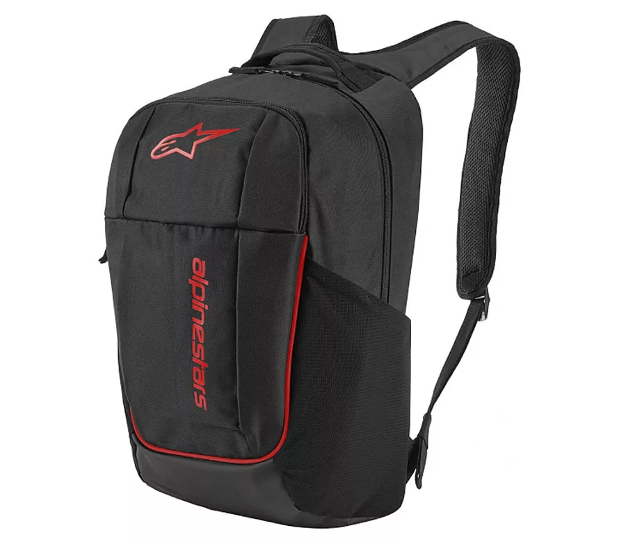 Batoh střední velikosti z kolekce podzim 2021. - Kolekce podzim 2021 - Odolný 600D polyester - Přihrádka na notebook s organizérem - Uvnitř batohu kapsa na zip - Dvě hlavní prostorné kapsy na zip - Boční síťové kapsy - Polstrovaná záda a nastavitelné ramenní popruhy - Nápis a logo Alpinestars na přední části batohu - Kapacita: 15.9 L - Barva: černá s červenými detaily - Materiál: 100% polyester