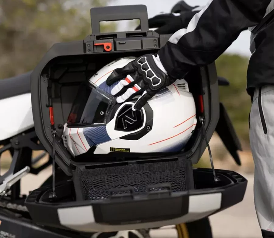 - Kufr lze otevřít, zavřít a sundat z motocyklu během několika sekund, stejně jako přenášet pomocí velké integrované výsuvné rukojeti.