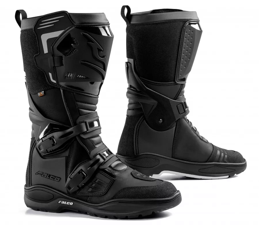 - vysoké boty s vnějším materiálem z kůže s olejovou úpravou - High-Tex voděodolná membrána - PU tvarovaný chránič holeně a Eso-Motion 2 zadní artikulační systém - D3O chrániče kotníků - černé aluminiové přezky a Velcro suchý zip - vysoce přilnavá gumová podrážka s texturou