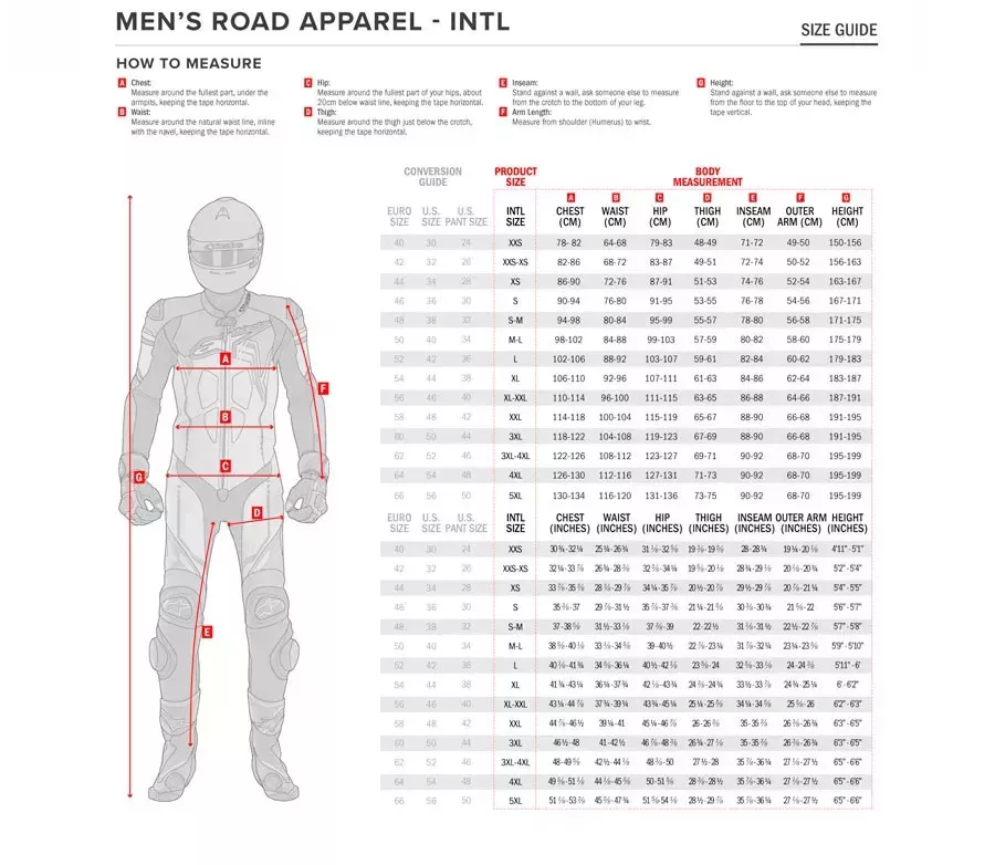 (cm)79-83 83-87 87-91 91–95 95–99 99-103 103–107 107-111 111–115 115–119 119–123 123–127 127-131 D. Stehno (cm) 48–49 50 - 51 52 - 53 54–55 56-57 58–59 60-61 62-63 64–65 66-67 68-69 70-71 72-73 E. Vnitřní šev (cm) 71-72 73-74 75-76 77-78 79-80 81-82 83-84 85-86 87-88 89-90 89-90 91-92 91-92 F. Vnější rameno (cm) 49–50 51-52 53–54 55–56 57-58 59 - 60 61-62 63-64 65-66 67-68 67-68 69-70 69-70 G. Výška (cm) 150–156 157-163 164–167 168-171 172–175 176–179 180–183 184–187 188–191 192–195 192–195 196–199 196–199 Pánské velikosti bot ALPINESTARS