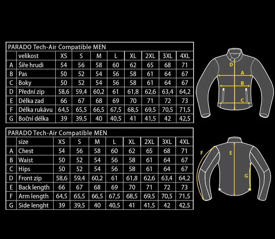 Svrchní materiál - 11.5oz Davos Denim, strečové panely TECH-AIR® COMPATIBLE - ergonomicky navrhnuto pro nošení s airbagovou vestou Tech-Air® 5 CHEVROON ARH 5.0 - originální speciální příprava na zádech pro Alpinestars Tech-Air® 5 vestu, které zajistí maximální pohodlí a funkčnost - zapsán do rejstříku průmyslových vzorů společenství EU vyvinutého společností Bikers Crown Podšívka - 100% recyklovaná Polyesterová podšívka + 3D síťovina Ochrana - výztuž v oblasti ramen, loktů a zad z DuPont Kevlaru - Prémiové flexibilní Sas-Tec chrániče CE level 2 na ramenou a loktech - kapsa na zádový protektor - CE certifikováno dle EN 17092-3, stupeň ochrany AA Nastavitelnost - strečové panely pro větší pohodlí - upravitelný obvod rukávu pomocí pásky s patentem - upravitelný obvod manžety rukávu pomocí zipu - magnet pro uchycení límce Ventilace - velká ventilační kapsa na dvojcestný zip (skládací systém se zipy) - dvě velké ventilační kapsy na boku - dvě velké ventilační kapsy na rukávech Speciální výhody - trojité šití na rukávech a ramenou - malá kapsička na mobil a kapsička s hadříkem z mikrovlákna - kožené logo Trilobite Bikers Crown obdržel pro své značky Trilobite jako jediný výrobce na světě souhlas od firmy Alpinestars pro používání airbagových systémů Tech-Air 5 do své výroby oblečení pro běžné motorkáře. Celý projekt a specifický vývoj oblečení trval velmi dlouho a byl prováděn souběžně s vývojem Tech-Air 5.