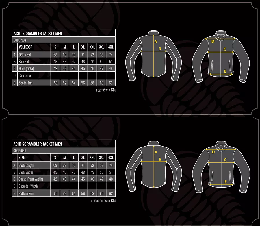 - vrchní materiál: 98% bavlna, 2% Lycra - váha džínoviny 11 oz - podšití materiálem 100% DuPont™ Kevlar® v oblasti zad, ramen a loktů - rukávy z pravé bůvolí kůže o tloušťce 0,8 mm - skryté větrací kapsy na stranách bundy - odnímatelná termo vložka - magnety na límci pro zajištění pozice límce při jízdě - kovové zipy YKK - zip na spojení s kalhotami - vnitřní kapsa - dvě vnější kapsy na hrudníku - strečové panely na loktech, ramenech a zádech - chrániče CE Level 1 - ramenní a loketní - tato bunda se výborně hodí ke kalhotám Acid Scrambler - dvě barevné varianty: s černými nebo hnědými rukávy - velikosti: S – 4XL - CE Certifikováno dle EN 17092-3:2020, level AA