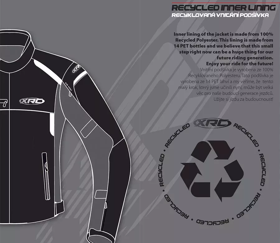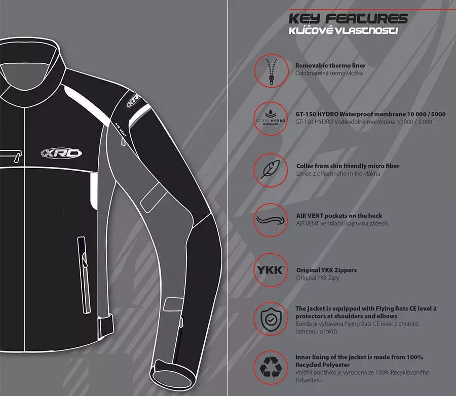 - Vrchní materiál: (65 %) Polyester Maxtex 600 D potažený PU, (35 %) Ripstop polyester - Podšívka z ECO recyklovaného polyesteru 210 - Plně izolační prošívaná podšívka snadno odnímatelná zipem - Nepromokavá membrána GT-150 HYDRO s vodním sloupcem 10000 mm a s prodyšností 5000 g/m2/24h - Součástí bundy jsou homologované chrániče loktů a ramen CE Level 2 - Příprava na zádový chránič, který je možno dokoupit zvlášť - Reflexní prvky na zádech a rukávech pro lepší viditelnost - Měkký komfortní límec na suchý zip - Snadno nastavitelné stahovací pásky na rukávech a bocích pro dokonalé padnutí - Na rukávech našita manžeta na suchý zip, kterou lze díky němu jednoduše rozšiřovat - 2 ventilační kapsy na hrudi - 2 velké ventilační kapsy na zádech - Voděodolné zipy - 2 přední kapsy na zip a 1 hrudní kapsa na zip - 1 vnitřní kapsa na zip vhodná pro vaše doklady či mobil - Zip ke spojení s kalhotami XRC Winkle - Kompatibilní s elektronickým airbagem Alpinestars Tech-Air 5® - 4 Airbag Designed® je ochranná známka zapsaná v rejstříku Úřadu průmyslového vlastnictví ČR - Certifikována dle aktuální normy EN 17092-3:2019 na level AA
