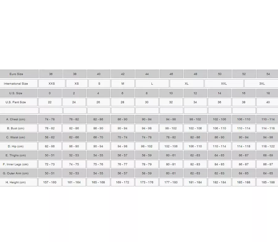 Velikost 120 130 140 150 Mezinárodní velikost S M L XL Velikost USA 22 24 26 28 A. Hrudník (cm) 60,5 - 65,5 65,5 - 70,5 70,5 - 75,5 75,5 - 80,5 B. Pas (cm) 54–58 58-62 62-66 66-70 C. Boky (cm) 68-72 72-76 75-80 80–84 D. Stehno (cm) 40 - 42 42 - 44 44 - 46 46-48 E. Vnitřní šev (cm) 51,1 - 56,5 56,5 - 61,5 61,5 - 66,5 66,5 - 71,5 F. Vnější rameno (cm) 40–44 44–48 48-52 52 - 56 G. Výška (cm) 120–130 130–140 140–150 150–160