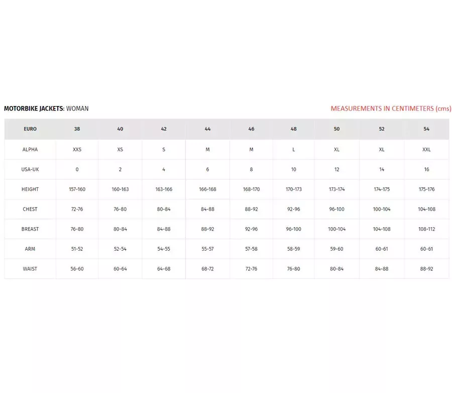 Dámské velikosti bund DAINESE