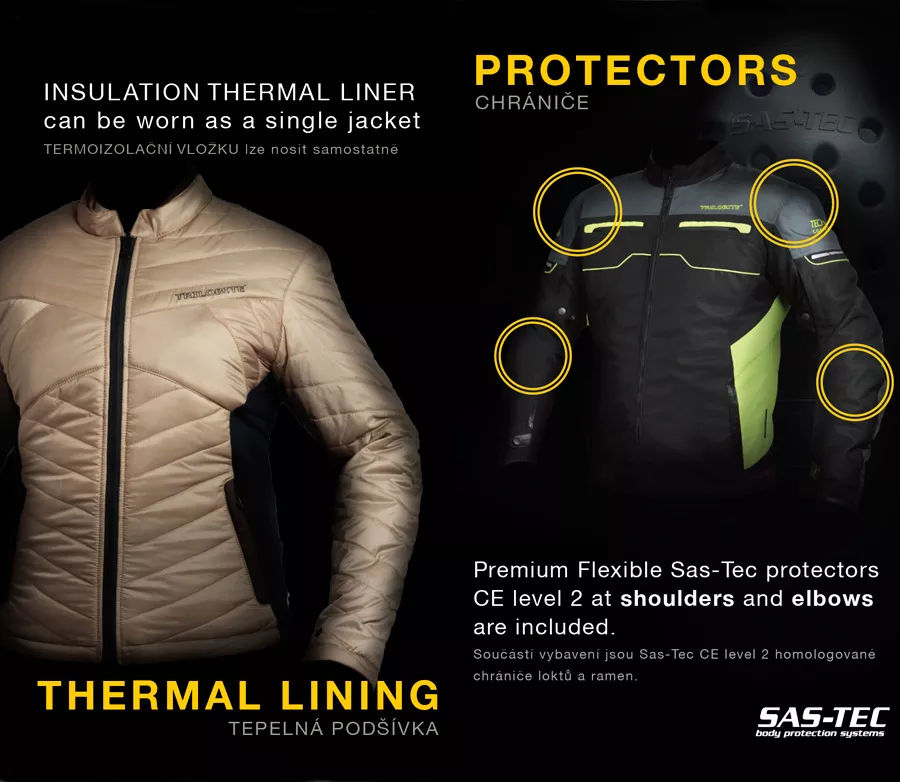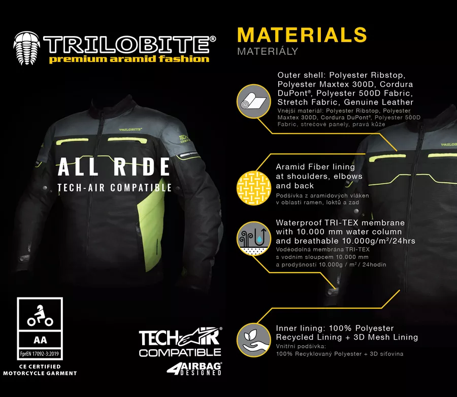 Svrchní materiál - Polyester Ribstop, Polyester Maxtex 300D, Cordura DuPont, Polyester 500D, strečové panely, pravá kůže TECH-AIR® COMPATIBLE - ergonomicky navrhnuto pro nošení s airbagovou vestou Tech-Air® 5 CHEVROON ARH 5.0 - originální speciální příprava na zádech pro Alpinestars Tech-Air® 5 vestu, které zajistí maximální pohodlí a funkčnost - zapsán do rejstříku průmyslových vzorů společenství EU vyvinutého společností Bikers Crown Podšívka - 100% recyklovaná vložka z Polyesteru + 3D síťovina Voděodolnost a prodyšnost - voděodolná membrána TRI-TEX s vodním sloupcem 10.000 mm a prodyšností 10.000 g / m2 / 24 hodin Ochrana - Kevlarová výztuž v oblasti ramen, loktů a zad - Prémiové flexibilní Sas-Tec chrániče CE level 2 na ramenou a loktech - kapsa na zádový protektor - CE certifikováno dle EN 17092-3, stupeň ochrany AA Viditelnost - Reflexní prvky na předním a zadním dílu a na rukávech Nastavitelnost - strečové panely pro větší pohodlí - upravitelný obvod rukávu pomocí pásky s patentem - upravitelný obvod manžety rukávu - patent na boku pro upravení velikosti Speciální výhody - Termoizolační odnímatelná vložka se dá nosit samostatně jako městská bunda - 2 malé kapsičky, 2 kapsičky s hadříkem z mikrovlákna - součástí bundy je reflexní obal na helmu s trojúhelníkem Bikers Crown obdržel pro své značky Nazran Motorcycle Fashion a Trilobite jako jediný výrobce na světě souhlas od firmy Alpinestars pro používání airbagových systémů Tech-Air 5 do své výroby oblečení pro běžné motorkáře. Celý projekt a specifický vývoj oblečení trval velmi dlouho a byl prováděn souběžně s vývojem Tech-Air 5.