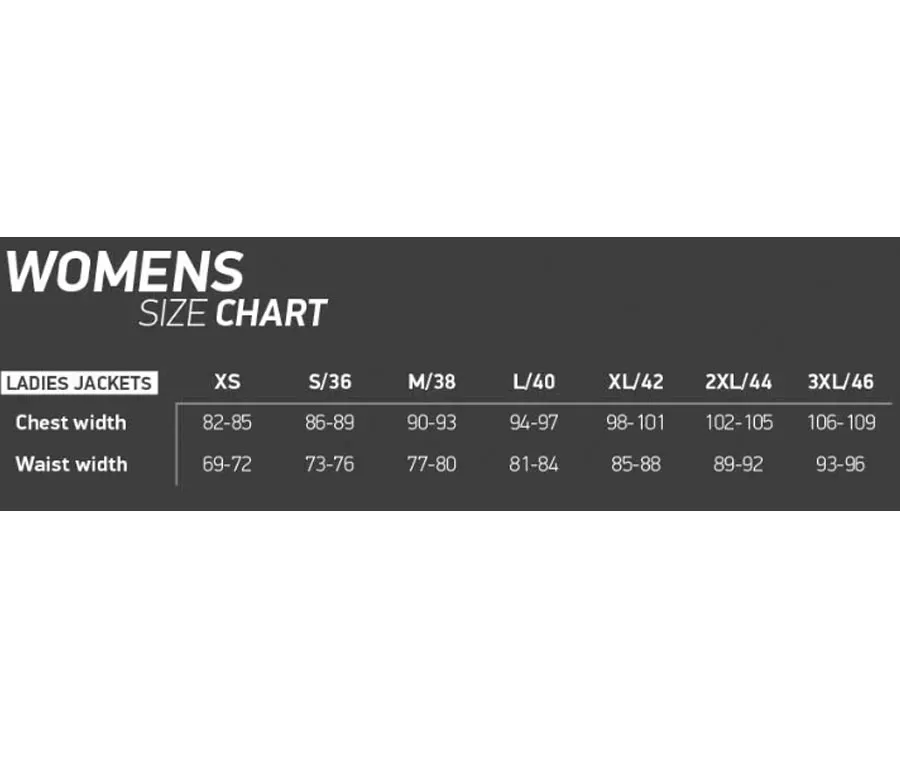 Velikost dámské bundy XS S / 36 M / 38 L / 40 XL / 42 2XL / 44 46 Obvod hrudníku (A) 82-85 86-89 90-93 94-97 98-101 102-105 106-109 Obvod pasu (B) 69-72 73-76 77-80 81-84 85-88 89-92 93-96 Dámské velikosti kalhot MACNA