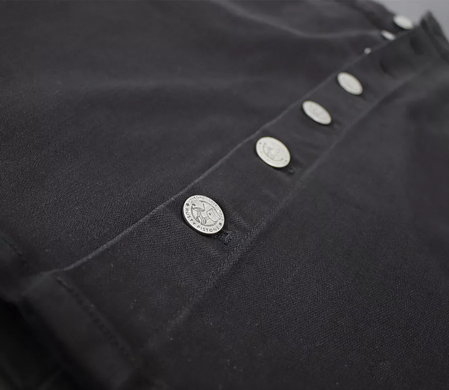 - Materiál: bavlna, elastan - jednoduchá úzká „cigaretová“ riflová sukně - zapínání vepředu na originální kovové Rusty Pistons knoflíky - 2 přední kapsy - v pase poutka na pásek - na zadní straně v pase kožená patch Rusty Pistons - záševky na zadní straně pro lepší siluetu - délka lehce pod kolena - dá se nosit v pase nebo na bocích, tím lze lehce upravit délka sukně a použít i pro „Office look“