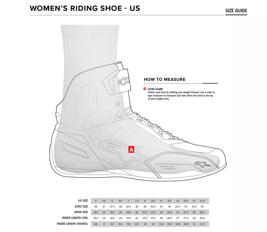(cm)157 - 162,5 162,5 - 168,5 168,5 - 172,5 172,5 - 176,5 176,5 - 180 180 - 182,5 182,5–185 185–188 Dámské velikosti bot ALPINESTARS