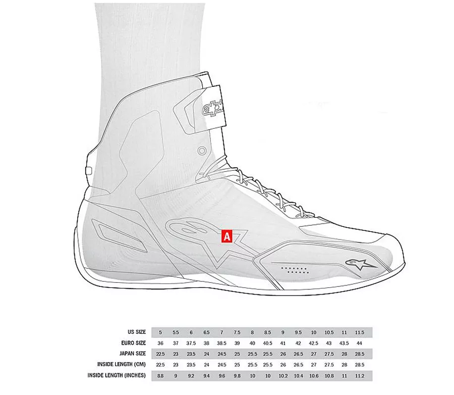 (cm)157 - 162,5 162,5 - 168,5 168,5 - 172,5 172,5 - 176,5 176,5 - 180 180 - 182,5 182,5–185 185–188 Dámské velikosti bot ALPINESTARS