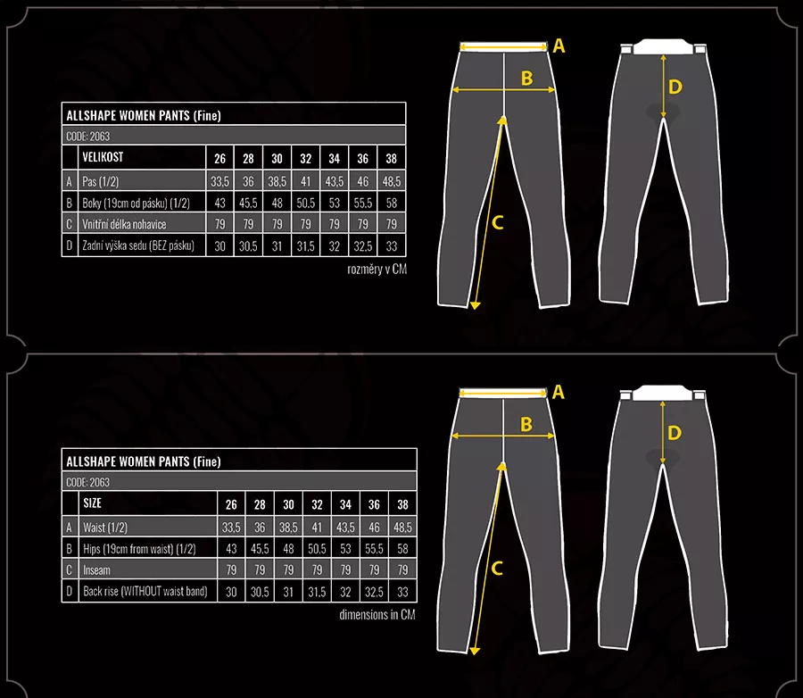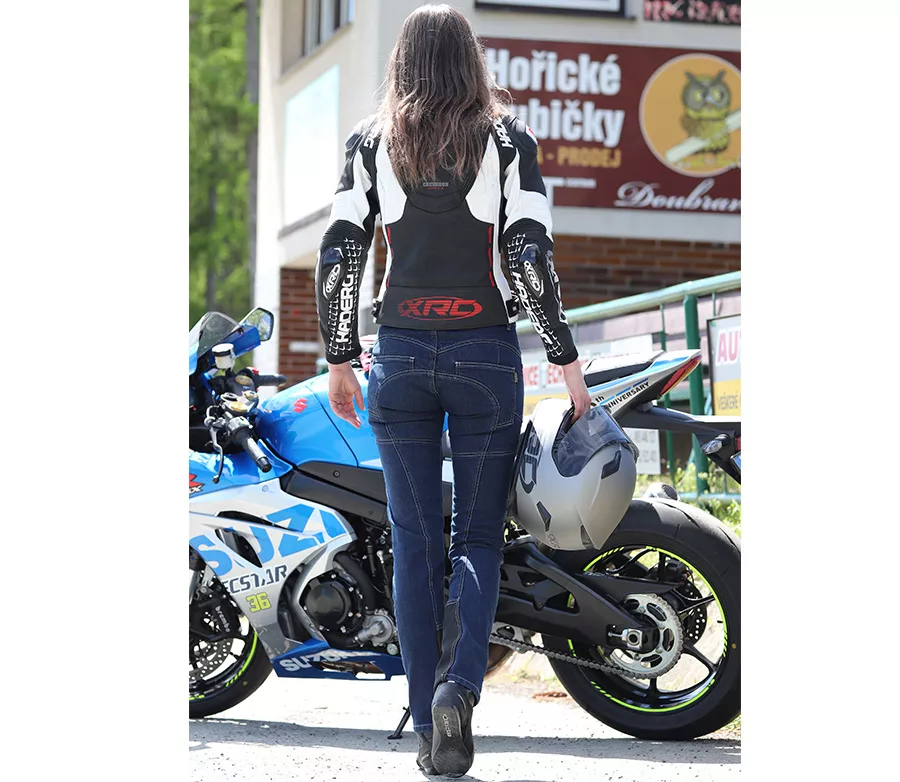 Každá dívka, která řídí motorku, nebo jen jezdí jako spolujezdec se svým partnerem, se chce obléci pohodlně, stylově a se všemi bezpečnostními prvky. ALLSHAPE jeans jsou parádním přírůstkem do nabídky motocyklového oblečení Trilobite. Tyto rifle byly vyvinuty se zaměřením na ženské tvary, speciálně zadeček. Ne všechny jsou stejné, ale všechny mohou vypadat skvěle! Přicházejí ve třech různých tvarech, které pozvedají křivky zadečku a ukazují ho v nejlepším světle. Na výrobu je použit denim s 5%elastanu, který zajišťuje pohodlí. Ochranu zajišťují kevlarové výztuže na kolenou a zadečku a doplňují je CE kolenní protektory třídy 2. Navíc jsou připravené na použití bočních chráničů, pokud chcete využít maximální ochrany. Rifle mají 2 přední kapsy a dvě zadní. Svrchní materiál - 95% Davos Denim (98% bavlna, 2%Elastan), 5% strečový materiál (100% Polyamid) Ochrana - kevlarová výztuž na kolenou a zadní části - chrániče kolen CE třídy 2 Výhody - 2 přední kapsy - 2 zadní kapsy Nastavitelnost - pásky v pase pro stažení Varianty - FINE–pro rovnou postavu bez výrazných křivek, kterým jsou většinou rifle v pase příliš těsné. Máte rovný pas, úzké boky a stehna?... Střih FINE je přesně pro vás. Dá vašemu zadečku správný tvar a nebude vás tlačit v pase. - REGULAR – pas bude perfektně sedět a nohy budou vypadat delší. - Jste proporcionálně tvarovaná od pasu k bokům? … Střih REGULAR je vaše volba. Dá vašemu zadečku správný tvar a nohy budou jednoduše vypadat delší. - DARING – už nikdy špatně sedící rifle díky zvýšenému zadnímu sedu - Máte normální pas a plnější zadeček a stehna? … Střih DARING je přesně pro vás. Díky delšímu zadnímu sedu vám rifle nebudou vzadu odstávat a váš zadeček bude vypadat skvěle.