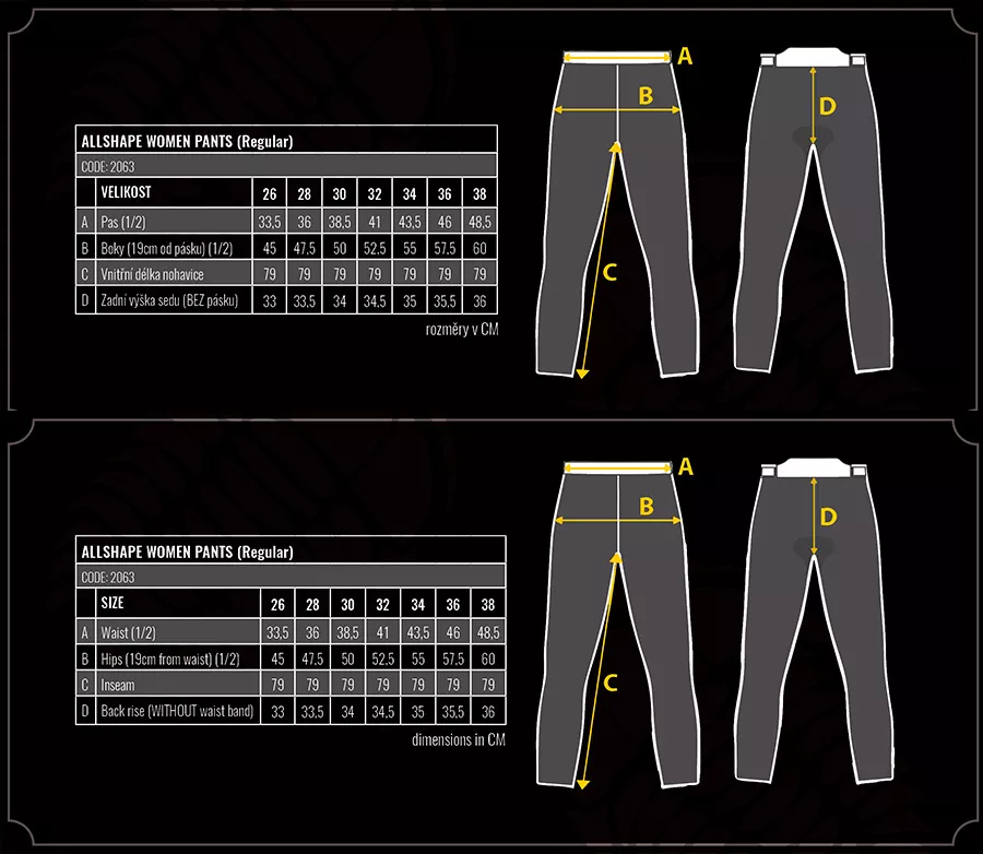 Každá dívka, která řídí motorku, nebo jen jezdí jako spolujezdec se svým partnerem, se chce obléci pohodlně, stylově a se všemi bezpečnostními prvky. ALLSHAPE jeans jsou parádním přírůstkem do nabídky motocyklového oblečení Trilobite. Tyto rifle byly vyvinuty se zaměřením na ženské tvary, speciálně zadeček. Ne všechny jsou stejné, ale všechny mohou vypadat skvěle! Přicházejí ve třech různých tvarech, které pozvedají křivky zadečku a ukazují ho v nejlepším světle. Na výrobu je použit denim s 5%elastanu, který zajišťuje pohodlí. Ochranu zajišťují kevlarové výztuže na kolenou a zadečku a doplňují je CE kolenní protektory třídy 2. Navíc jsou připravené na použití bočních chráničů, pokud chcete využít maximální ochrany. Rifle mají 2 přední kapsy a dvě zadní. Svrchní materiál - 95% Davos Denim (98% bavlna, 2%Elastan), 5% strečový materiál (100% Polyamid) Ochrana - kevlarová výztuž na kolenou a zadní části - chrániče kolen CE třídy 2 Výhody - 2 přední kapsy - 2 zadní kapsy Nastavitelnost - pásky v pase pro stažení Varianty - FINE–pro rovnou postavu bez výrazných křivek, kterým jsou většinou rifle v pase příliš těsné. Máte rovný pas, úzké boky a stehna?... Střih FINE je přesně pro vás. Dá vašemu zadečku správný tvar a nebude vás tlačit v pase. - REGULAR – pas bude perfektně sedět a nohy budou vypadat delší. - Jste proporcionálně tvarovaná od pasu k bokům? … Střih REGULAR je vaše volba. Dá vašemu zadečku správný tvar a nohy budou jednoduše vypadat delší. - DARING – už nikdy špatně sedící rifle díky zvýšenému zadnímu sedu - Máte normální pas a plnější zadeček a stehna? … Střih DARING je přesně pro vás. Díky delšímu zadnímu sedu vám rifle nebudou vzadu odstávat a váš zadeček bude vypadat skvěle.