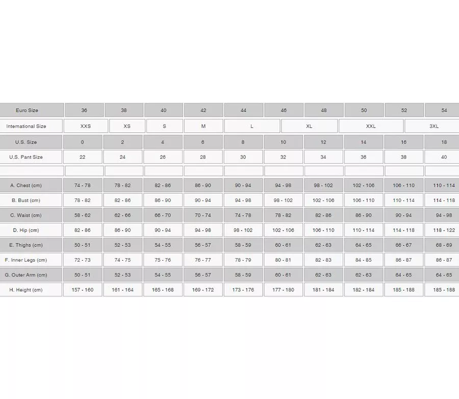 Velikost 120 130 140 150 Mezinárodní velikost S M L XL Velikost USA 22 24 26 28 A. Hrudník (cm) 60,5 - 65,5 65,5 - 70,5 70,5 - 75,5 75,5 - 80,5 B. Pas (cm) 54–58 58-62 62-66 66-70 C. Boky (cm) 68-72 72-76 75-80 80–84 D. Stehno (cm) 40 - 42 42 - 44 44 - 46 46-48 E. Vnitřní šev (cm) 51,1 - 56,5 56,5 - 61,5 61,5 - 66,5 66,5 - 71,5 F. Vnější rameno (cm) 40–44 44–48 48-52 52 - 56 G. Výška (cm) 120–130 130–140 140–150 150–160