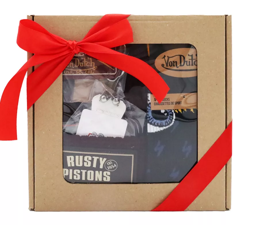Nevíte, co darovat ? Dárkový balíček plný stylových dárků! Vše je krásně zabaleno v dárkové krabici. V balíčku naleznete:Von Dutch Eyeout klíčenkaRusty Pistons Vernon red one size beaniePonožky Von Dutch Lotg (2 páry)SKULL náušnice