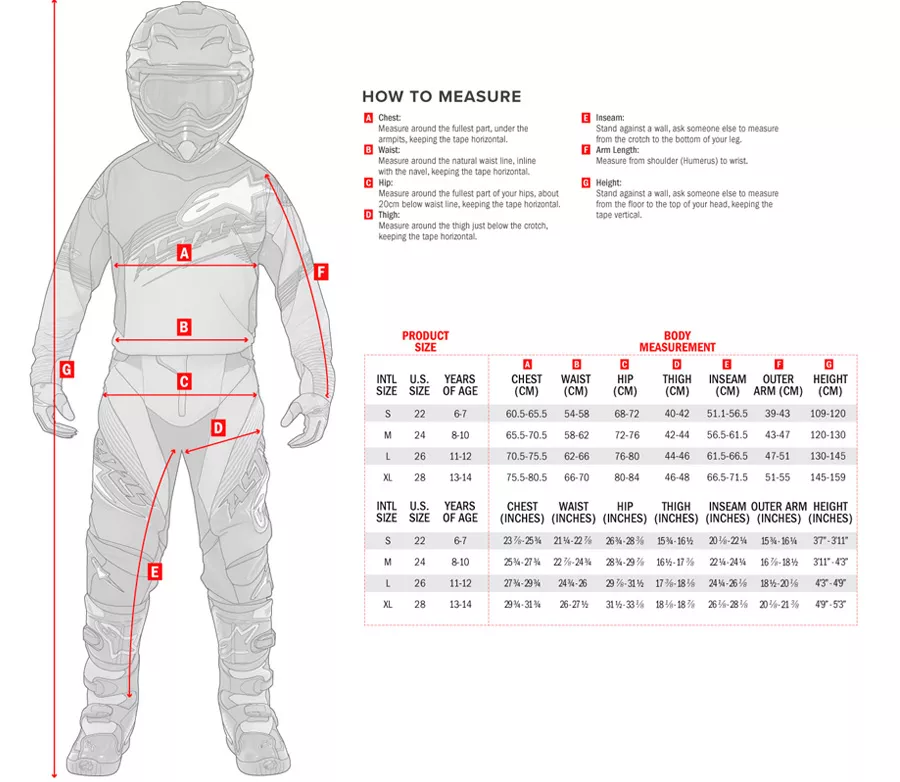 (cm)79-83 83-87 87-91 91–95 95–99 99-103 103–107 107-111 111–115 115–119 119–123 123–127 127-131 D. Stehno (cm) 48–49 50 - 51 52 - 53 54–55 56-57 58–59 60-61 62-63 64–65 66-67 68-69 70-71 72-73 E. Vnitřní šev (cm) 71-72 73-74 75-76 77-78 79-80 81-82 83-84 85-86 87-88 89-90 89-90 91-92 91-92 F. Vnější rameno (cm) 49–50 51-52 53–54 55–56 57-58 59 - 60 61-62 63-64 65-66 67-68 67-68 69-70 69-70 G. Výška (cm) 150–156 157-163 164–167 168-171 172–175 176–179 180–183 184–187 188–191 192–195 192–195 196–199 196–199 Pánské velikosti bot ALPINESTARS