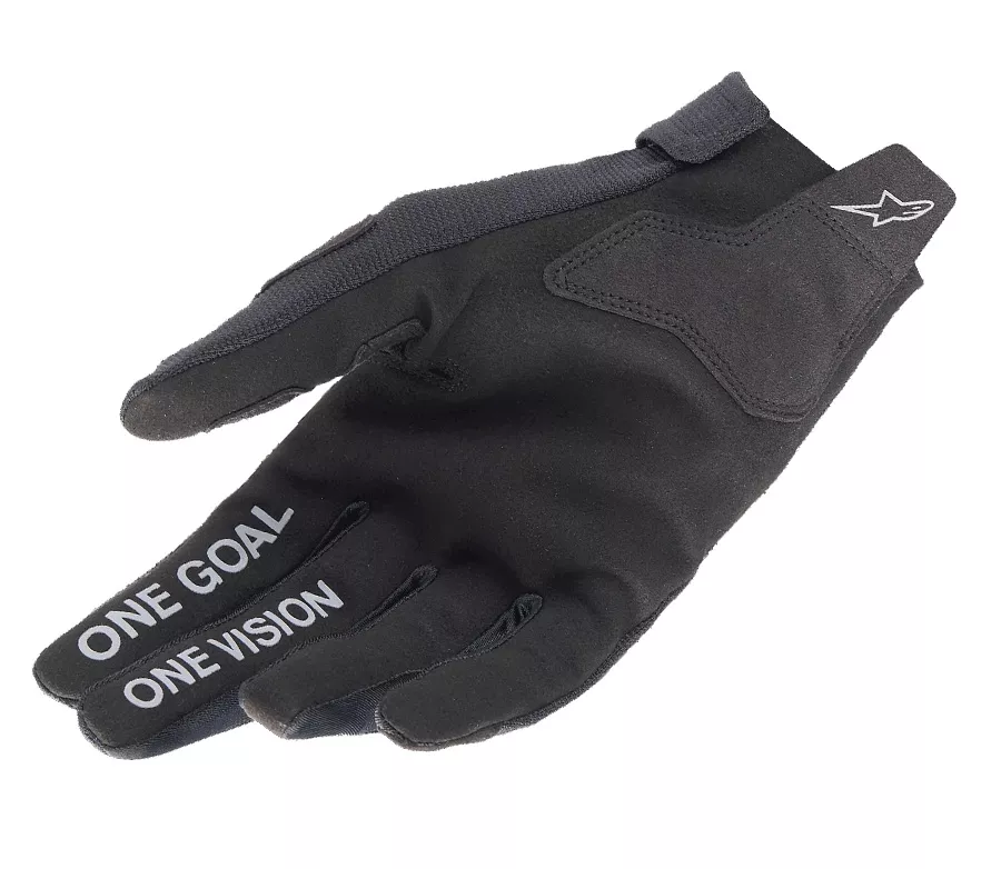 Lehké závodní rukavice s manžetou na suchý zip, jednou vrstvou materiálu na dlani pro maximální grip v řídítkách a nápaditým dvoudílným potiskem na dlani s mottem "ONE GOAL/ONE VISION". Nejrozšířenější model v nabídce rukavic ALPINESTARS MX kolekce. Konstrukce - navrženo s důrazem pro vysoký komfort a cit v dlani se zakřiveným střihem prstů pro lepší práci s gripem - hřbet dlaně a boky prstů ze strečové tkaniny pro pružnost, lehkost a maximální prodyšnost - dlaň z jedné vrstvy pevné a odolné syntetické kůže s perforacemi na prstech - vyztužený palec pro zvýšení pevnosti v namáhaných místech rukavice - silikonové gripy na ukazováčku, prostředníčku a poutku - dvoudílný silikonový potisk na dlani "ONE GOAL/ONE VISION" - výtažné poutko s protiskluzovým potiskem pro snadnější nasazování - trvanlivý tisk sublimační grafiky na hřbetu rukavice - manžeta na suchý zip Střih - pružný můstek v dlaňové části mezi palcem a ukazováčkem podšitý streč textilií pro lepší práci s gripy