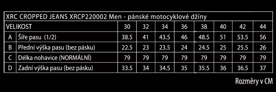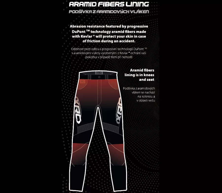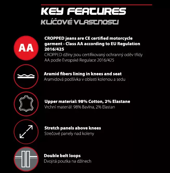 - vnější materiál 98% bavlna, 2% lycra - 100% DuPont Kevlar vyztužení na strategických místech - strečové panely nad koleny - originál YKK zip na poklopci - kovový knoflík s logem XRC - XRC logo na stehně - dvojitá poutka na pásek - zvýšená bederní část pro maximální komfort - chrániče CE level 2 na kolenou - příprava pro chrániče boků - nejsou součástí - certifikace EN 17092-3:2020 level AA - dostupné v dámské a pánské variantě