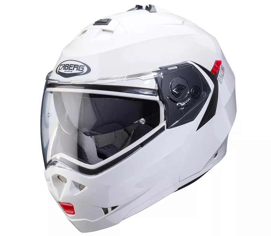 DUKE X je výsledkem nabytých zkušeností společnosti Caberg, která byla první italskou společností vyrábějící výklopné helmy. DUKE X přichází s duální homologací P/J, která umožňuje jízdu s otevřeným chráničem brady. Díky zámku výklopné části je možná aretace bradové části v poloze „J“ (vyklopená). Tato páčka brání nechtěnému zavření bradové části během jízdy.