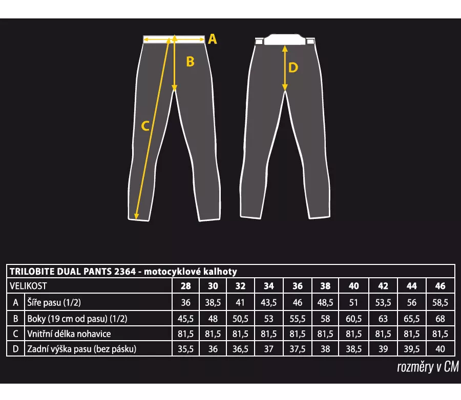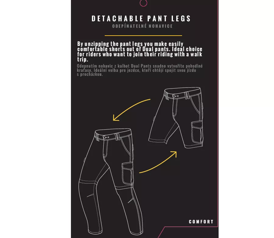 - dobře známý model Dual, který prošel „faceliftem“ a byl doplněn o další výhody - svrchní materiál je plátno, 100% bavlna - podšití kevlarovým vláknem v oblasti kolen, zadku a zadní části stehen - nastavitelná výška chráničů kolen - CE Level 2 chrániče na kolenou a bocích součástí - 2 v 1 – kalhoty a šortky zároveň – na stehně je zip pro odejmutí nohavice - na pravém stehně je kapsa na mobil - trojité prošití na strategických místech „tripple stitching“ - dvojitá očka na pásek - zapínání na 2 knoflíky a zip - CE Certifikováno dle EN 17092-3:2020 - kolekce Trilobite 2023 prošla změnou „brand identity“ čili na kalhotách najdete nová Trilobite loga - pouze v pánském střihu