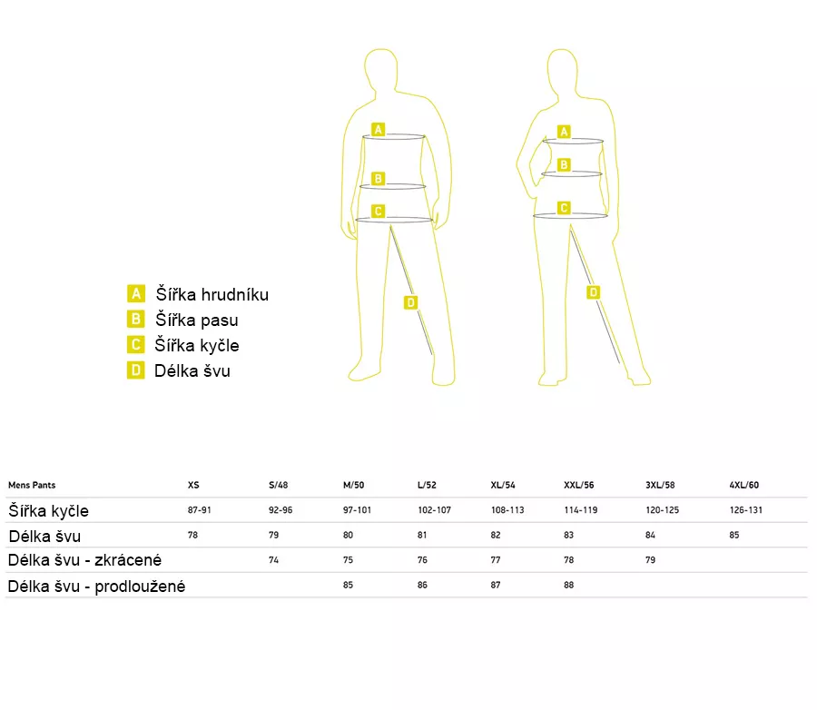 Velikost pánské bundy XS S / 48 M / 50 L / 52 XL / 54 2XL / 56 3XL / 58 4XL / 60 5XL 6XL Obvod hrudníku (A) 89-93 94-98 99-103 104-109 110-115 116-121 122-127 128-133 134-139 140-145 Obvod pasu (B) 76-80 81-85 86-90 91-95 96-102 103-109 110-116 117-123 124-130 131-137 Pánské velikosti kalhot MACNA