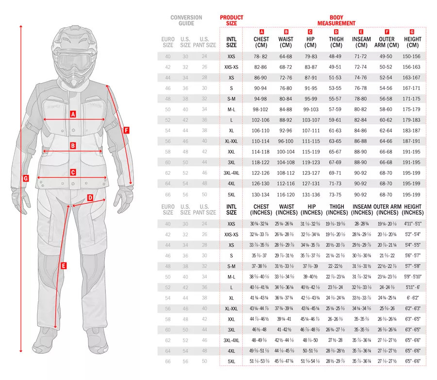 (cm)79-83 83-87 87-91 91–95 95–99 99-103 103–107 107-111 111–115 115–119 119–123 123–127 127-131 D. Stehno (cm) 48–49 50 - 51 52 - 53 54–55 56-57 58–59 60-61 62-63 64–65 66-67 68-69 70-71 72-73 E. Vnitřní šev (cm) 71-72 73-74 75-76 77-78 79-80 81-82 83-84 85-86 87-88 89-90 89-90 91-92 91-92 F. Vnější rameno (cm) 49–50 51-52 53–54 55–56 57-58 59 - 60 61-62 63-64 65-66 67-68 67-68 69-70 69-70 G. Výška (cm) 150–156 157-163 164–167 168-171 172–175 176–179 180–183 184–187 188–191 192–195 192–195 196–199 196–199 Pánské velikosti bot ALPINESTARS