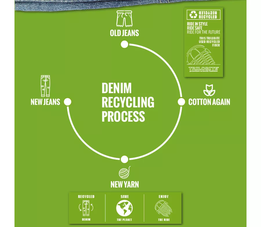 Trilobite® si dal za cíl změnit konvenční způsob výroby motocyklového oblečení. Zatímco v odvětví sportovního oblečení je dnes běžné používání recyklovaných materiálů při výrobě oděvů, zejména v technickém oblečení pro lyžaře a snowboardisty, v odvětví motocyklového oblečení se jedná o ojedinělý přístup. Trilobite® je pravděpodobně jedna z prvních značek motocyklového oblečení, která při výrobě používá recyklované materiály. - ve standardní i prodloužené délce - vnější materiál: 11.5 oz Recycled Elastic Denim, 98% Cotton, 2% Elastane - 100% DuPont Kevlar vyztužení - pružný materiál v rozkroku zajišťuje dvoudimenzní elasticitu a zaručuje komfort pohybu při jízdě na motocyklu - vyrobeno z elastomeru v kombinaci s polyamidovými vlákny - originální YKK kovové zipy na poklopci a na ventilačních kapsách - kovový knoflík s logem Trilobite v pase - vpředu dvojitá poutka na pásek - v bederní oblasti zvýšený pas pro maximální komfort při jízdě - chrániče CE Level 2 na kolenou a bocích - certifikace CE EN17092 třída AA Protože TRILOBITE tým věří v kvalitu a úroveň ochrany, kterou jeho produkty poskytují, rozhodl se nechat model Parado otestovat na bezpečnost. Výsledky jsou velmi přesvědčivé a dokazují, že jeans jsou opravdu bezpečným produktem. Jeans byly testovány z hlediska odolnosti proti oděru a roztržení. Součástí jsou kolenní a boční chrániče CE LEVEL 2. Kolenní chrániče CE LEVEL 2 je možné posouvat do stran a na potřebnou výšku 100% KEVLAR Lycra by Dupont - na kolenou, bocích a hýždích - značkové aramidové vlákno pokrokové technologie Dupont, které se vyznačuje vysokou pevností a odolností v oděru - odolný proti roztržení - vysoký stupeň tavení 450°C zajištuje bezpečí v případě vysoké třecí teploty STRETCH panel - zvyšuje optimální pohodlí a umožňuje dvoudimenzní elasticitu - zaručuje komfort pohybu při jízdě na motocyklu - vyrobeno z elastomeru v kombinaci s polyamidovými vlákny vzduchová VENTILACE - nezbytná ventilace pro opravdu horké letní dny - zvyšuje komfort a pohodlí při jízdě na motocyklu