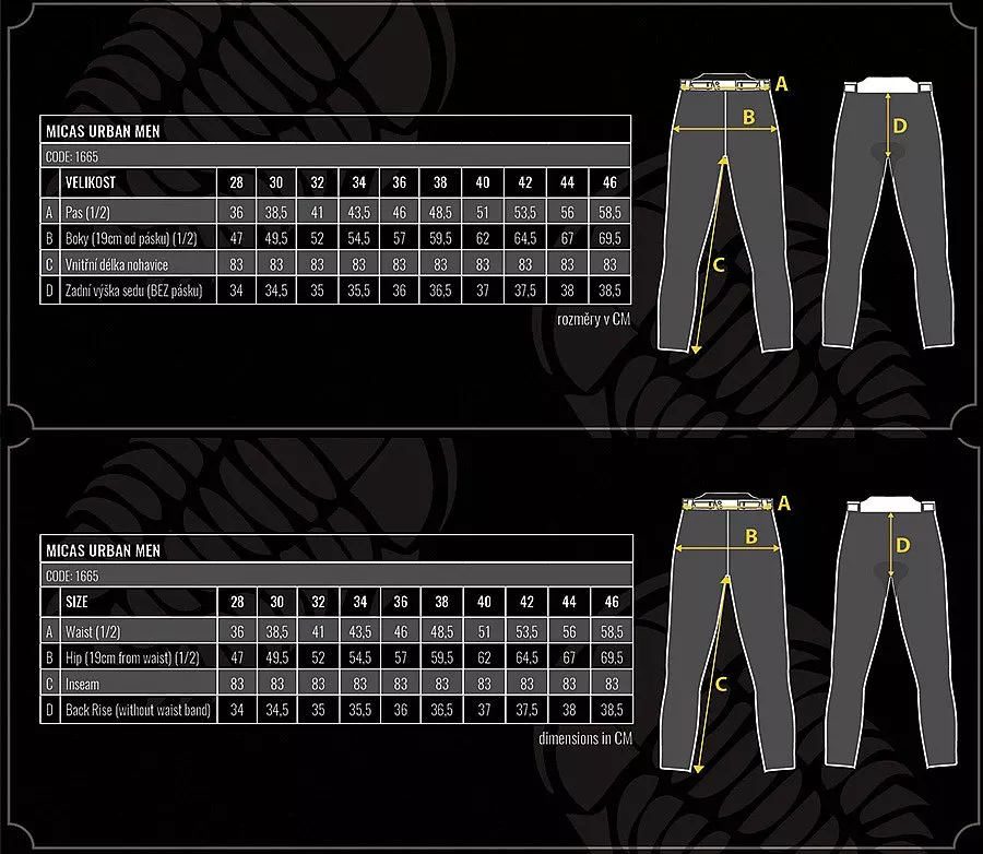 Micas Urban jsou motocyklové džíny s ochrannými prvky a civilním vzhledem. Tato stylovka je k dispozici v různých barvách. Urban vzhled dělá z těchto džínů skvělou volbu pro motorkáře, kteří se na svém stroji pohybují převážně po městě. Svou funkčností tyto džíny uspokojí jak jezdce na skútru, tak i motorkáře na jejich naháčích a streetech při projížďkách ulicemi města a po silnicích v jeho blízkém okolí. Elastický denim poskytuje maximální komfort i těmto slim-fit džínám. Kolenní strečové panely jsou vkusně zasazené a vypadají jako módní prvek. Vysoký pas vzadu zakryje jezdci při jízdě spodní část zad. Micas džíny jsou podšity aramidovými vlákny vyrobenými z originálního materiálu Kevlar® firmou DuPont ™. Podšívka pokrývá kolena a boky, a zajistí odolnost proti oděru. Micas Urban se dodávají standardně s kolenními chrániči. Vkládání kolenních chráničů je velmi snadné díky skrytému zipu v kolenním strečovém panelu. Džíny mají přípravu na chrániče boků. - vnější materiál: elastický denim 11,5 oz, 98 % bavlna, 2 % elastan - podšívka: podšití aramidovými vlákny v oblasti kolen a zadní strany stehen materiálem Kevlar® vyrobeného progresivní technologií společností DuPont ™ - chrániče: kolenní chrániče CE Level 2, příprava pro chrániče boků Ergonomické vlastnosti: - 5 kapes - strečové panely nad koleny - vnější vstup do kapes na kolenní chrániče - nastavitelná výška chráničů kolen - vyvýšený pas Na co se hodí: Urban styl, skútr a street, dostupné v pánských slim-fit velikostech (30-44) a dámských (26-36). Perfektně se hodí k mikinám a košilím Trilobite® Kevlar® a DuPont ™ jsou ochranné známky nebo registrované ochranné známky společnosti E.I. du Pont de Nemours and company.