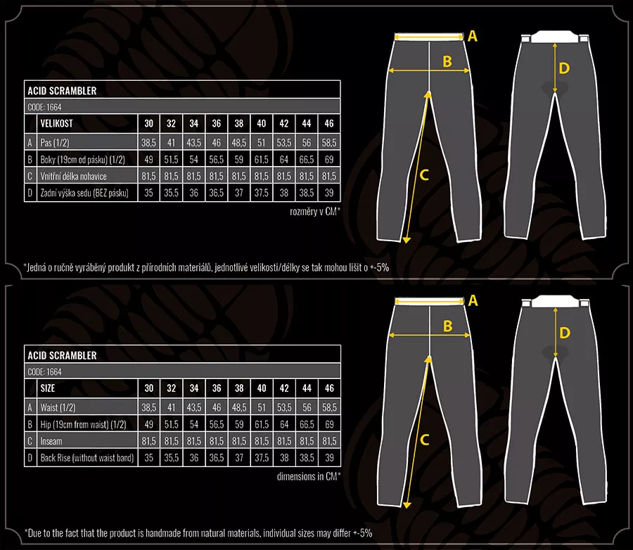 Tyto džíny jsou nutností pro všechny vyznavače vintage stylu a zejména pro fanoušky scramblerů. Retro vzhled docílený pomocí pracího procesu vytváří autentické oblečení pro vintage jezdce. Nejenže vám tyto džíny zajistí perfektní vzhled, ale i absolutní pohodlí a podstatnou míru bezpečnosti. Tyto džíny ve střihu slim-straight vám bezpochyby skvěle padnou, protože jsou vyrobené z elastického denimu. Funkční a dobře vypadající strečové panely nad koleny, v rozkroku a zadní části pasu podporují celkový komfort. Oděruvzdorná podšívka z materiálu Kevlar®, vyrobená progresivní technologií DuPont ™ v oblastech kolen a zadní části stehen, vás v případě potřeby ochrání proti odření. Vyjímatelné chrániče, které splňují úroveň CE level 2 na kolenou a bocích, jsou dodávány jako standardní příslušenství. Poskytují účinnou ochranu při nárazu. Při výrobě džínů Acid Scrambler se používají pouze vysoce kvalitní komponenty. Kovové zipy YKK a originální materiál Kevlar® od společnosti DuPont ™. Když jezdíte v teplých letních dnech, nenápadné větrací kapsy na stehnech zajistí potřebný přísun čerstvého vzduchu vždy, když ho potřebujete. Vyvýšený pas zakryje spodní část vašich zad. Boční kapsy na suchý se hodí pro uložení nezbytností. MATERIÁL vnější materiál: elastický denim 11,5 oz, 98 % bavlna, 2 % elastan podšívka: aramidová vlákna v oblasti kolen a zadní strany stehen z materiálu Kevlar® vyrobeného progresivní technologií DuPont ™ BEZPEČNOST chrániče CE Level 2 na kolenou a bocích CE Certifikováno dle EN 17092-3:2020, level AA ERGONOMICKÉ VLASTNOSTI 4 standardní kapsy a dvě boční kapsy na suchý zip strečové panely nad koleny, v pase a rozkroku nastavitelná výška kolenních chráničů dvojitá poutka vpředu vyvýšený pas VENTILACE větrací kapsy na stehnech prodyšný panel v rozkroku