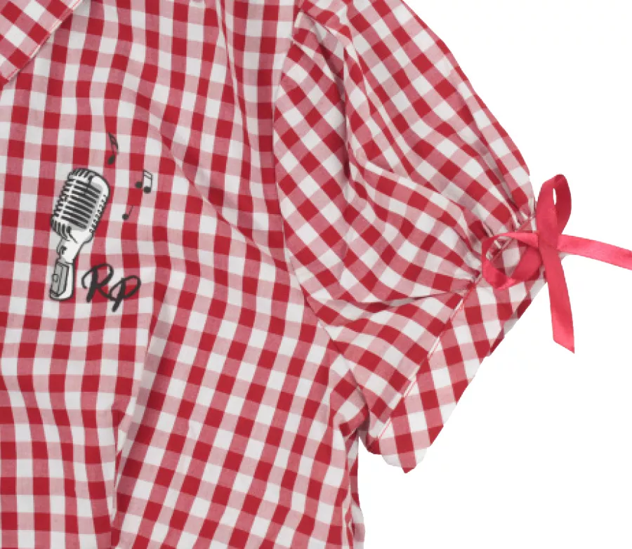 - materiál: 100% bavlna - design jemné kostky - projmutý střih se zavázáním v pase - přímá výšivka na přední straně a na zádech - malé stuhy na rukávech