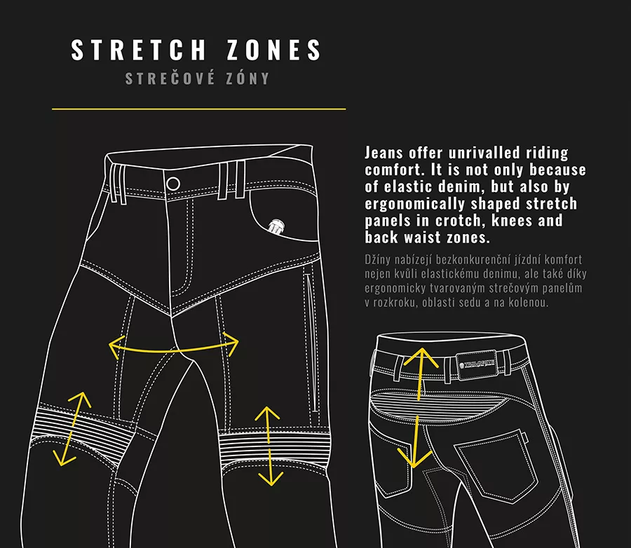 Nová generace nejžádanějších motocyklových jeans na trhu! Trilobite Parado Circuit jsou jediné moto jeans z nabídky Trilobite®, které se můžou pochlubit certifikací označenou třemi "áčkami". Ta je nejčastěji k vidění na kožených racingových bundách nebo kombinézách. Tyto džíny jsou vyrobeny z velice odolného materiálu TRI-FORCE®, který se vyrábí spojením bavlněného vlákna s vláknem UHMWPE. Tento exkluzivní technologický proces vytváří pravý denim s pevným jádrem a díky tomu disponuje materiál TRI-FORCE® mechanickými vlastnostmi pravé kůže. Díky němu dosahují kalhoty Trilobite Parado Circuit extrémní ochranu v jedné vrstvě! Džíny nabízí bezkonkurenční jízdní komfort nejen kvůli elastickému denimu, ale také díky ergonomicky tvarovaným strečovým panelům v rozkroku, oblasti sedu a na kolenou. Součástí kalhot jsou vyjímatelné chrániče SAS-TEC CE level 2, které jsou umístěny na kolenou a bocích. Zaručují maximální ochranu při případném pádu v těchto partiích těla. Při jízdě v horkých letních dnech určitě oceníte velké ventilační kapsy na stehnech, které pustí čerstvý vzduch přesně tam, kde je zapotřebí. VNĚJŠÍ MATERIÁL: - Davos Denim, TRI-FORCE® (52% bavlna, 42% UHMWPE, 5% Elasto Multi-Ester, 1% elastan), Stretch Fabric STRETCH panel - zvyšuje optimální pohodlí a umožňuje dvoudimenzní elasticitu - zaručuje komfort pohybu při jízdě na motocyklu - vyrobeno z elastomeru v kombinaci s polyamidovými vlákny VENTILACE - nezbytná ventilace pro opravdu horké letní dny - zvyšuje komfort a pohodlí při jízdě na motocyklu ERGONOMICKÉ VLASTNOSTI - 5 kapes - strečové panely na kolenou, v pase a rozkroku - nastavitelná výška chráničů kolen - dvojitá poutka - zvýšený bederní pás Součástí jsou kolenní a boční chrániče CE LEVEL 2. Kolenní chrániče CE LEVEL 2 je možné posouvat do stran a na potřebnou výšku Co je vlastně certifikace označená AAA?