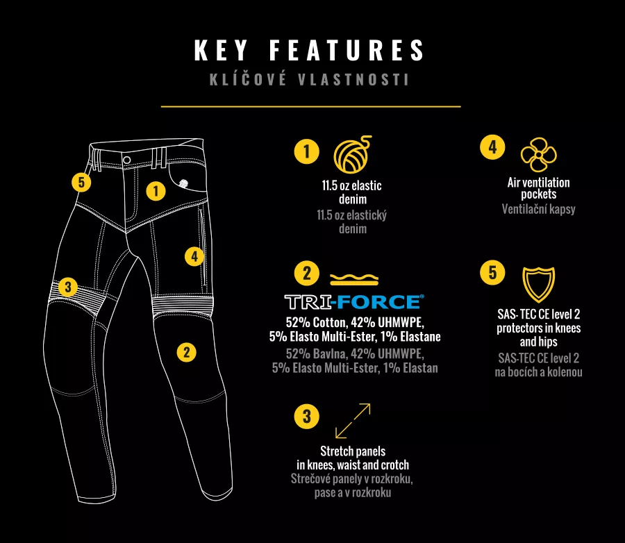 Nová generace nejžádanějších motocyklových jeans na trhu! Trilobite Parado Circuit jsou jediné moto jeans z nabídky Trilobite®, které se můžou pochlubit certifikací označenou třemi "áčkami". Ta je nejčastěji k vidění na kožených racingových bundách nebo kombinézách. Tyto džíny jsou vyrobeny z velice odolného materiálu TRI-FORCE®, který se vyrábí spojením bavlněného vlákna s vláknem UHMWPE. Tento exkluzivní technologický proces vytváří pravý denim s pevným jádrem a díky tomu disponuje materiál TRI-FORCE® mechanickými vlastnostmi pravé kůže. Díky němu dosahují kalhoty Trilobite Parado Circuit extrémní ochranu v jedné vrstvě! Džíny nabízí bezkonkurenční jízdní komfort nejen kvůli elastickému denimu, ale také díky ergonomicky tvarovaným strečovým panelům v rozkroku, oblasti sedu a na kolenou. Součástí kalhot jsou vyjímatelné chrániče SAS-TEC CE level 2, které jsou umístěny na kolenou a bocích. Zaručují maximální ochranu při případném pádu v těchto partiích těla. Při jízdě v horkých letních dnech určitě oceníte velké ventilační kapsy na stehnech, které pustí čerstvý vzduch přesně tam, kde je zapotřebí. VNĚJŠÍ MATERIÁL: - Davos Denim, TRI-FORCE® (52% bavlna, 42% UHMWPE, 5% Elasto Multi-Ester, 1% elastan), Stretch Fabric STRETCH panel - zvyšuje optimální pohodlí a umožňuje dvoudimenzní elasticitu - zaručuje komfort pohybu při jízdě na motocyklu - vyrobeno z elastomeru v kombinaci s polyamidovými vlákny VENTILACE - nezbytná ventilace pro opravdu horké letní dny - zvyšuje komfort a pohodlí při jízdě na motocyklu ERGONOMICKÉ VLASTNOSTI - 5 kapes - strečové panely na kolenou, v pase a rozkroku - nastavitelná výška chráničů kolen - dvojitá poutka - zvýšený bederní pás Součástí jsou kolenní a boční chrániče CE LEVEL 2. Kolenní chrániče CE LEVEL 2 je možné posouvat do stran a na potřebnou výšku Co je vlastně certifikace označená AAA? Bezpečnost při jízdě na motorce je dnes mnohem častěji skloňována než-li dříve. Proto je hlavním cílem značky Trilobite® nabízet kvalitní a bezpečné oblečení pro motorkáře. Džíny Trilobite® jsou testovány podle nejnovějších norem EU. Nová norma EU EN 17092: 2020 přináší nové zkušební metody, které mohou mnohem lépe simulovat skutečnou odolnost výrobků při nárazu či oděru. Každá úroveň ochrany udává dobu odolnosti proti oděru při "klouzání" po asfaltu. Existují tři úrovně A - AAA. Podle nich je možné rozdělit obleční pro různé typy použití v souladu s odolností proti oděru. Pro nejrizikovější jízdu jsou vyvjíjeny produkty s odolností proti oděru dosahující úrovně AAA. Tu nejčastěji vidíme u kožených závodních kombinéz například. Takto označené oblečení může poskytnout ty nejúčinnější ochranné prvky v případě pádu. Oblečení certifikované v úrovni AA je stále velmi bezpečné! Ale s některými nižšími vlastnostmi oproti oblečení s certifikací AAA. Výrobky s úrovní A jsou vyvinuty pro jízdu v nižších rychlostech a nižších rizicích. Oficiální stránky Trilobite: www.trilobitemoto.com