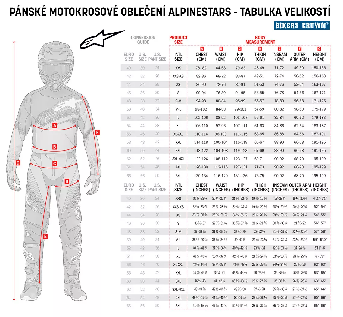 (cm)79-83 83-87 87-91 91–95 95–99 99-103 103–107 107-111 111–115 115–119 119–123 123–127 127-131 D. Stehno (cm) 48–49 50 - 51 52 - 53 54–55 56-57 58–59 60-61 62-63 64–65 66-67 68-69 70-71 72-73 E. Vnitřní šev (cm) 71-72 73-74 75-76 77-78 79-80 81-82 83-84 85-86 87-88 89-90 89-90 91-92 91-92 F. Vnější rameno (cm) 49–50 51-52 53–54 55–56 57-58 59 - 60 61-62 63-64 65-66 67-68 67-68 69-70 69-70 G. Výška (cm) 150–156 157-163 164–167 168-171 172–175 176–179 180–183 184–187 188–191 192–195 192–195 196–199 196–199 Pánské velikosti bot ALPINESTARS