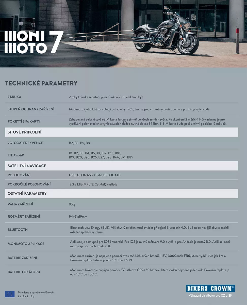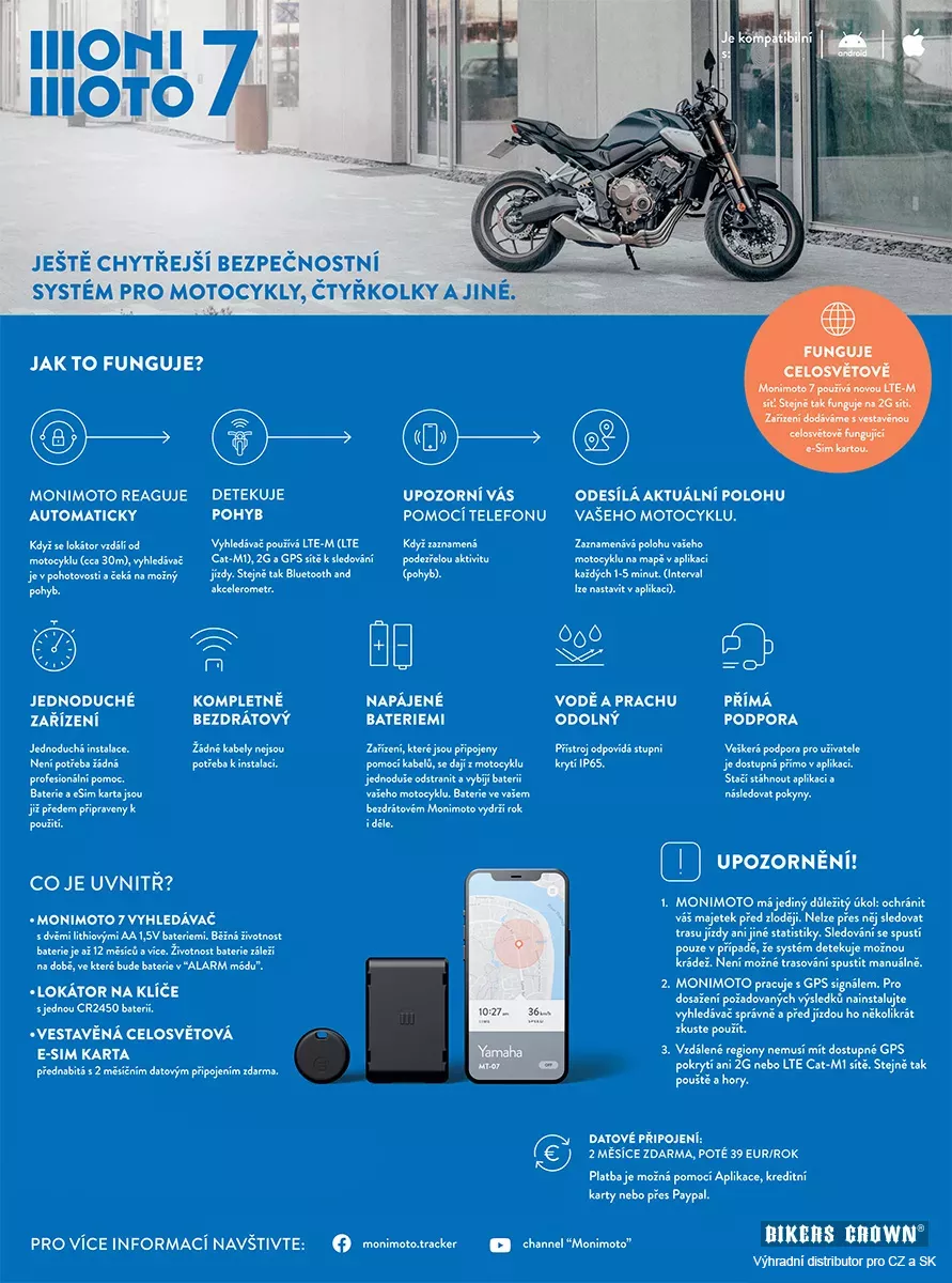 Náhradní lokátor k bezpečnostnímu vyhledávacímu systému Monimoto Motorcycle Tracker 7. Monimoto poskytuje vašemu motocyklu ochranu před zloději. Můžete svoji motorku nechat bez dozoru ve městě i přírodě. Lze ho libovolně přemisťovat na všechny vaše dopravní prostředky. Na jednom chytrém telefonu může operovat hned několik vyhledávačů a každý vyhledávač může být spárován až se třemi lokátory. V momentě, kdy detekuje Monimoto pohyb čili možnost krádeže, okamžitě posílá informaci na váš mobilní telefon – to vše v 50 sekundách. Funguje celosvětově, takže je vaše motorka chráněna téměř kdekoliv! Monimoto 7 používá novou LTE-M síť. Stejně tak funguje na 2G síti. - Bezdrátový - Je kompatibilní se všemi motocykly - Plně přenosný - Jednoduchá instalace - Baterie a eSim karta jsou předem instalované a připravené k použití. - Vodě a prachu odolný - Přístroj odpovídá IP65 - Je kompatibilní s Android i Apple zařízeními - Zařízení je dodáváno s vestavěnou celosvětově fungující e-Sim kartou - V ceně je i lokátor na klíče, který lze zakoupit i samostatně DATOVÉ PŘIPOJENÍ 2 měsíce po zakoupení Monimoto Tracker 7 je připojení zcela zdarma. Poté se platí jednorázový poplatek 39 Eur ročně. Tato platba je možna pomocí aplikace, platební karty nebo Paypalem. JAK TO FUNGUJE? Monimoto reaguje automaticky, když se lokátor vzdálí od motocyklu na cca 30 m. Vyhledávač je neustále v pohotovosti a čeká na možný pohyb. Jakmile k němu dojde, upozorní vás pomocí informace na mobil, že zaznamenává podezřelou aktivitu (pohyb). Vyhledávač používá ke sledování jízdy LTE-M (LTE Cat-M1), 2G a GPS sítě. Stejně tak Bluetooth a akcelerometr. Zaznamenává polohu vašeho motocyklu na mapě v aplikaci každých 1-5 minut (interval lze nastavit v aplikaci) a posílá vám ji na mobil. JEŠTĚ NEŽ SI VYHLEDÁVAČ MONIMOTO ZAKOUPÍTE 1) Monimoto Tracker 7 má jediný důležitý úkol: ochránit váš majetek před zloději. Nelze přes něj sledovat trasu jízdy ani jiné statistiky. Sledování se spustí pouze v případě, že systém detekuje možnou krádež. Není možné trasování spustit manuálně. 2) Po nainstalování aplikace a spárování vašeho telefonu s lokátorem, umístěte vyhledávač (tělo Monimoto Tracker 7) na váš motocykl. Buďte nápadití! Najděte na motorce takové místo, které zloděj nebude předpokládat. Před instalací vždy proveďte test spojení a nasimulujte krádež, abyste se ujistili, že systém správně funguje. 3) 95% motocyklů má spoustu míst, kam se dá Monimoto Tracker 7 ukrýt. Možná budete mít problém najít správné místo u naháčů, custom motorek a off-roadových strojů, ale určitě něco najdete! :-) 4) Monimoto pracuje s GPS signálem. Pro dosažení kýžených výsledků nainstalujte vyhledávač správně a před jízdou ho několikrát odzkoušejte. 5) Vzdálené regiony nemusí mít dostupné GPS pokrytí ani 2G nebo LTE Cat-M1 sítě. Stejně tak pouště a hory. Užijte si jízdu! Monimoto se postará o bezpečnost...