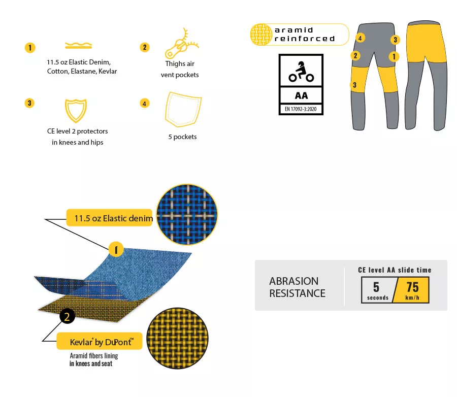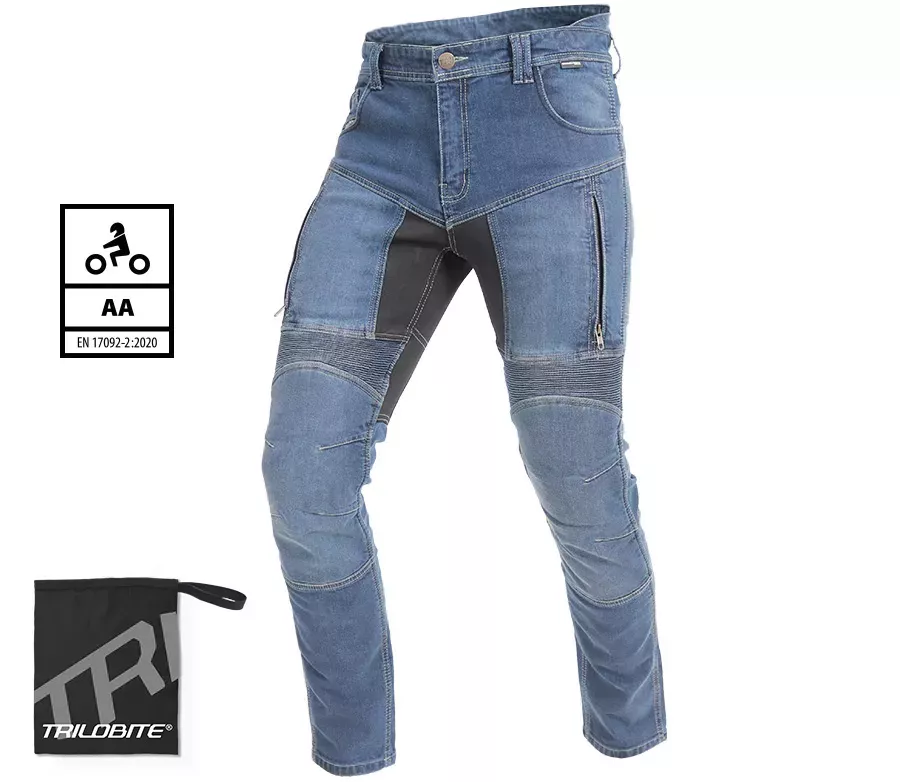 - ve standardní i prodloužené délce - vnější materiál: 98% bavlna, 2% lycra - váha vnějšího materiálu: 12.5 oz - 100% DuPont Kevlar vyztužení - podšívka: 65% bavlna & 35% polyester - pružný materiál v rozkroku zajišťuje dvoudimenzní elasticitu a zaručuje komfort pohybu při jízdě na motocyklu - vyrobeno z elastomeru v kombinaci s polyamidovými vlákny - originální YKK kovové zipy na poklopci a na ventilačních kapsách - kovový knoflík s logem Trilobite v pase - vpředu dvojitá poutka na pásek - v bederní oblasti zvýšený pas pro maximální komfort při jízdě - chrániče CE Level 2 na kolenou a bocích - certifikace CE EN17092 třída AA Protože TRILOBITE tým věří v kvalitu a úroveň ochrany, kterou jeho produkty poskytují, rozhodl se nechat model 661 Parado otestovat na bezpečnost. Výsledky jsou velmi přesvědčivé a dokazují, že jeans jsou opravdu bezpečným produktem. Jeans byly testovány z hlediska odolnosti proti oděru a roztržení. Součástí jsou kolenní a boční chrániče CE LEVEL 2. Kolenní chrániče CE LEVEL 2 je možné posouvat do stran a na potřebnou výšku 100% KEVLAR Lycra by Dupont - na kolenou, bocích a hýždích - značkové aramidové vlákno pokrokové technologie Dupont, které se vyznačuje vysokou pevností a odolností v oděru - odolný proti roztržení - vysoký stupeň tavení 450°C zajištuje bezpečí v případě vysoké třecí teploty STRETCH panel - zvyšuje optimální pohodlí a umožňuje dvoudimenzní elasticitu - zaručuje komfort pohybu při jízdě na motocyklu - vyrobeno z elastomeru v kombinaci s polyamidovými vlákny vzduchová VENTILACE - nezbytná ventilace pro opravdu horké letní dny - zvyšuje komfort a pohodlí při jízdě na motocyklu