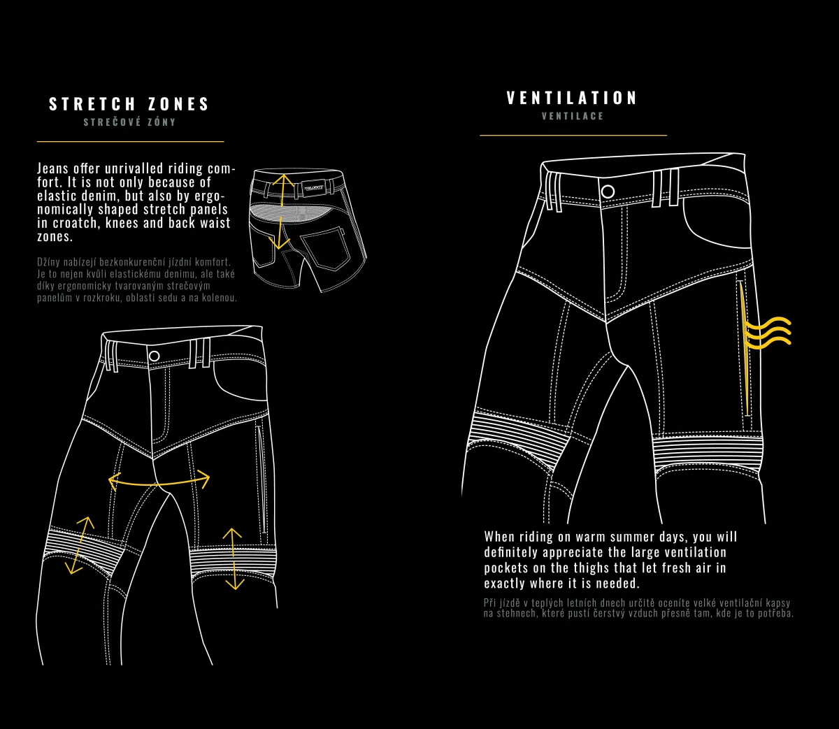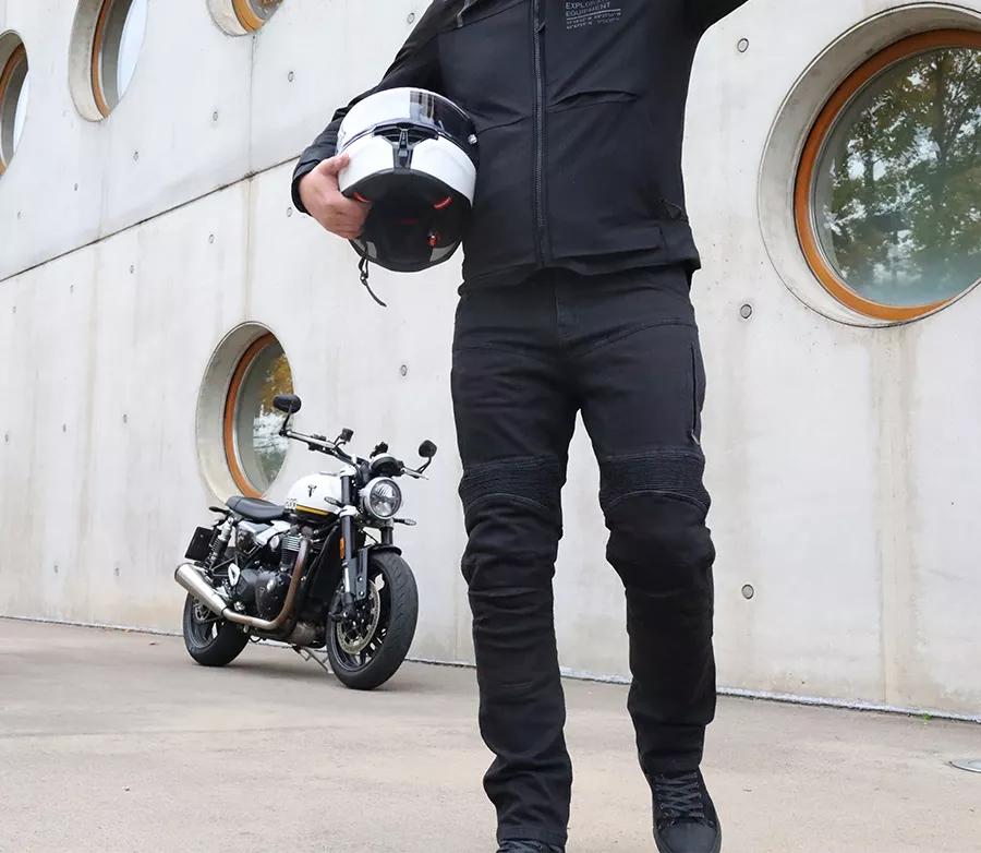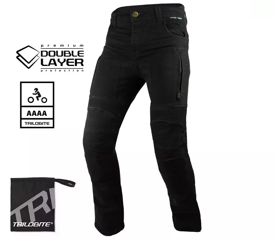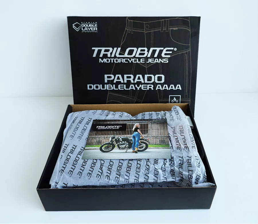 Materiál (vnější vrstva) • TRI-STRETCHER® PRO 5.0 DENIM je speciální směsí Bavlny, Elastanu a Polyesteru. Ochrana: • Zóny dopadu jsou vyztuženy druhou vrstvou TRI-STRETCHER® PRO 5.0 DENIM • CE level 2 chrániče kolen a boků součástí • Výškově nastavitelné kolenní chrániče • CE Certifikováno dle EN 17092-2:2020, třída AAA Ergonomické vlastnosti: • 2 přední kapsy, 2 zadní kapsy • Stretch vrstva v oblasti kolen, zadního pasu a rozkroku • Dvojitá poutka na opasek vepředu • Zvýšený pas Ventilace: • Ventilační kapsy na stehnech • Podyšný streč v oblasti sedu Parado Doublelayer AAAA jsou dodávány v krabici spolu s voděodolným vakem, který se skvěle hodí při cestování. Vlastnosti materiálu Tri-Stretcher® PRO 5.0 Denim Základní myšlenkou bylo vyvinout tkaninu, která bude vynikat pohodlím, bezpečností a zároveň splní náročné požadavky na střih, opotřebení, roztržení, otěruvzdornost a chemickou odolnost finálního výrobku při CE Certifikačních testech. Tri-Stretcher® PRO 5.0 Denim je speciální směsí Bavlny, Elastanu a Polyesteru patentovaná společností Bikers Crown s.r.o., která je výhradním vlastníkem materiálu a zároveň designérem motocyklových džínů Trilobite. Díky nedávným průlomům v oblasti syntetických vláken mohou být džíny pro jízdu na motocyklu lehčí než kdykoliv předtím. Nová generace syntetických a polyethylenových vláken umožňuje smíchat Polyester, Nylon, Elastan a další příze, například i přírodní, do zcela nové, sofistikované tkaniny pro výrobu motocyklových džínů Trilobite. Tri-Stretcher® PRO 5.0 Denim je moderní technická tkanina, která je budoucností jízdy na motocyklu. Vyrábí se ze směsi materiálů z rodiny polyamidů jako je Nylon a aromatických polyamidů, jako je Aramid nebo polyuretanová vlákna vyrobená z Elastanu, a zároveň zahrnuje přírodní bavlněnou tkaninu. Tato látka je jedinečná svou úžasnou pevností a zároveň nízkou hmotností. Tri-Stretcher® PRO 5.0 Denim je jeden „chytrý tým“ různých vláken spletených dohromady, které vás v případě nehody ochrání stejným způsobem jako celokožená kombinéza, ale bez kompromisu na pohodlí. Tyto džíny jsou vyrobeny ze dvou vrstev nejodolnějšího materiálu Tri-Stretcher 5.0 Denim. Jedna vrstva tohoto materiálu splňuje CE certifikační požadavky levelu AAA. Proto spojením dvou vrstev této látky vznikly zatím nejbezpečnější džíny na světě, které Trilobite označuje AAAA.