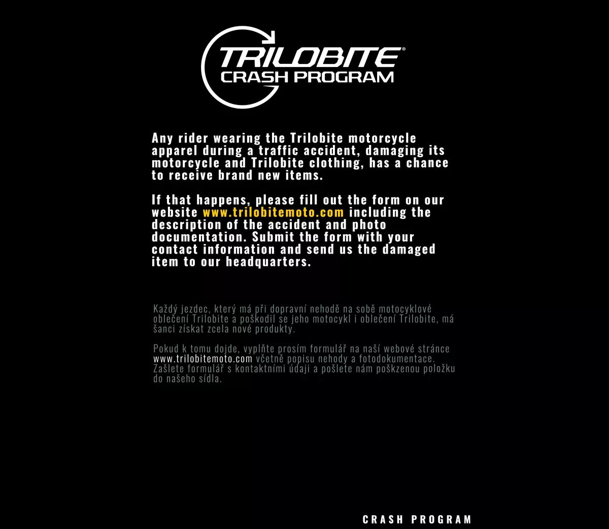 Značka TRILOBITE® nabízí svým zákazníkům možnost využití tzv. TRILOBITE® Crash programu. Každý jezdec, který je účastníkem dopravní nehody a nosí motocyklové jeans TRILOBITE®, které během nehody poškodí, automaticky získá zcela nové produkty. Tento program funguje tak, že svou nehodu popíšete, zdokumentujete a pošlete informace na centrálu spolu s poškozenými kalhotami. Výrobce TRILOBITE® vše zanalyzuje a poznatky použije při vývoji dalších výrobků. V případě splnění podmínek vám zašle zcela nový kus.