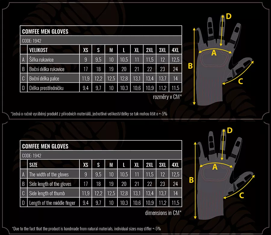 Jednoduché s maximální volností pohybu pro jízdu v lese a v přírodě pro všechny fandy scramblerů a lehkého endura. Tam, kde na vás nečíhá nebezpečí pádu na asfaltový povrch a hlavním předpokladem je naprostá svoboda pohybu, stejně tak jak tomu je u motokrosových rukavic. Rukavice Trilobite Comfee nabízí kombinaci retro vzhledu, zvýšené ochrany a pohodlí sportovních rukavic. Hovězí barvená kůže té nejvyšší kvality (A+) je použita na vnější straně rukavice a na malíčku. Pro perfektní vnímání odezvy od ovládacích prvků motocyklu (spojka, brzda a rukojeť plynu) při jízdě je použit pružný spandex, který je příjemný i při dlouhé nebo náročné jízdě v terénu. Syntetická kůže se silikonovým potiskem na spodní straně všech prstů pomáhá zajistit vynikající úchop na brzdové a spojkové páčce a eliminuje klouzání prstů při přeřazení nebo brzdění. Dlaň rukavic je vyztužena, což pomáhá bránit proti otlakům dlaní během dlouhých cest. Při navlékání rukavic oceníte poutko, díky kterému rukavice snadno nasadíte na ruku.
