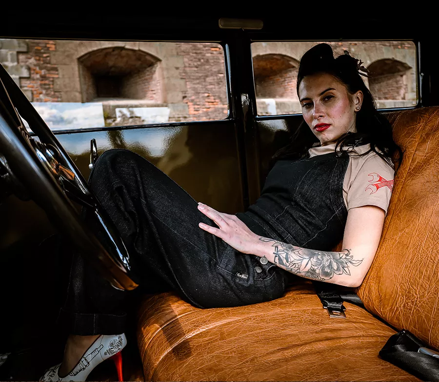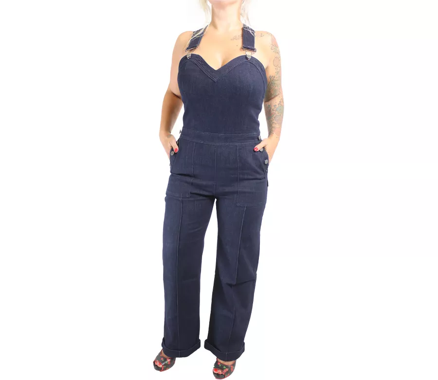 - Materiál: bavlna, elastan, polyester - riflový overal na kšandy - vrchní díl je střižen jako tílko - zvýrazňuje ženské přednosti - délka kšand je upravitelná pomocí kovové přezky - zapínání na skrytý zip - „falešné“ originální kovové Rusty Pistons knoflíky po stranách - velké kapsy na bocích - velmi široké nohavice se zašitými puky - manžeta nohavic zažehlená do „ohrnky“ - zadní strana bez jakýchkoliv rušivých elementů pro vyniknutí postavy - na zadní straně v pase kožená patch Rusty Pistons