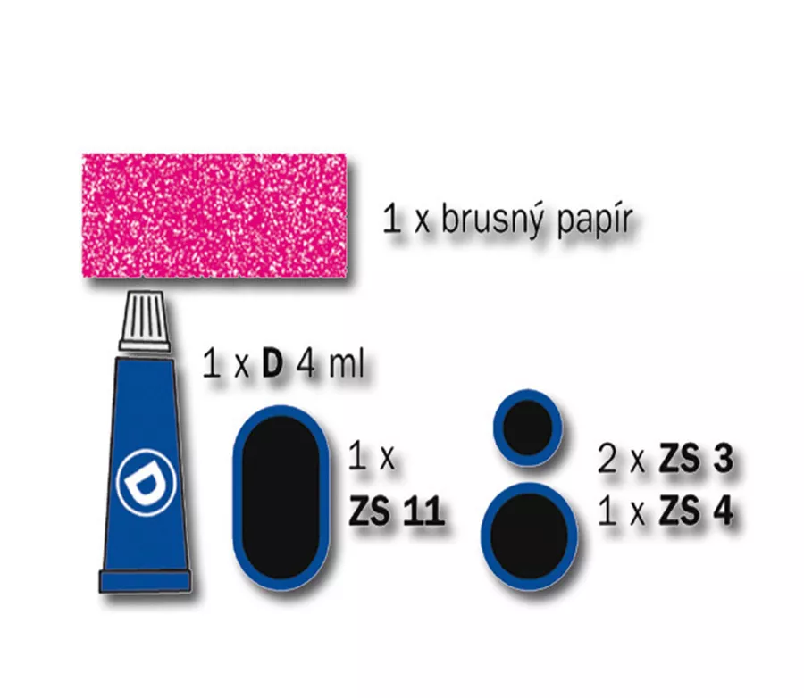 Souprava na opravu duší určená pro motocykly k rychlému a efektivnímu vyřešení defektu. Obsah soupravy: - 1 x brusný papír - 1 x vulkanizační roztok D 4 ml (lepidlo) - 1 x záplata ZS 11 (rozměr 75 x 35 mm) - 2 x záplata ZS 3 (průměr 37 mm) - 1 x záplata ZS 4 (průměr 46 mm)