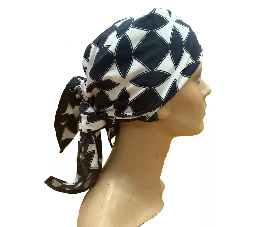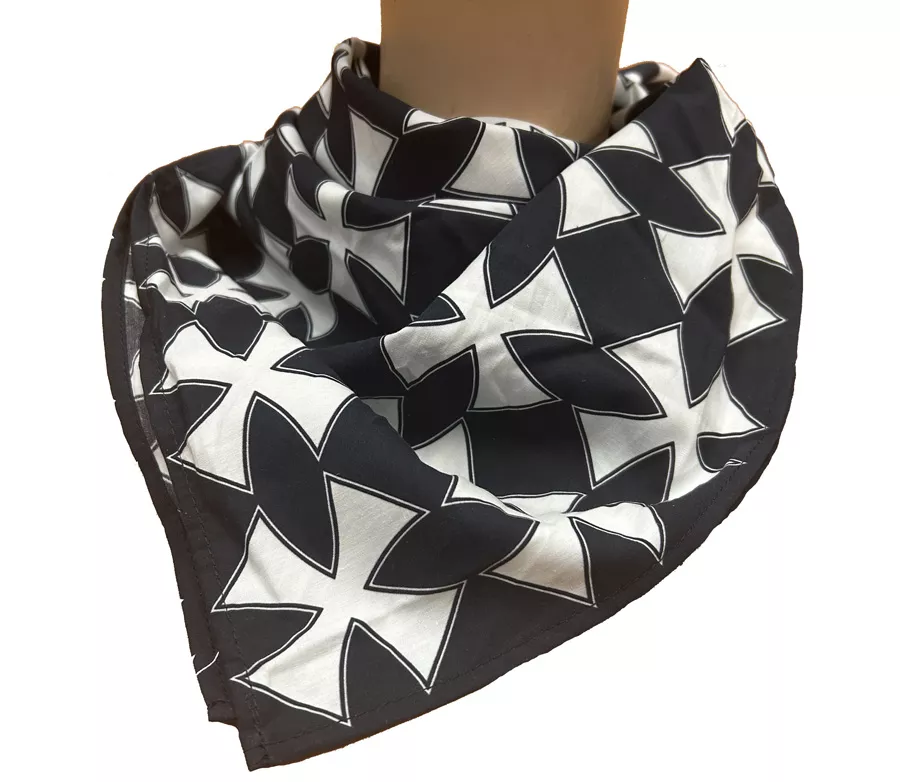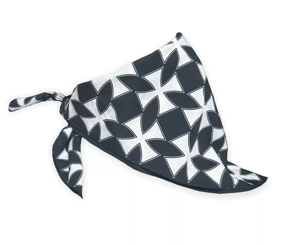 Velký čtyřcípý šátek s jedinečným motivem. Tyto šátky jsou cca o 25 cm větší než standardně prodávané šátky s různými motorkářskými, westernovými či jinými motivy. Šátek lze použít na hlavu jako čepičku, na obličej jako masku, na krk jako šálu či jinak dle fantazie každého uživatele. Před prvním použitím je třeba šátek vyprat. Vzhledem k technologii výroby by mohl při prvním dešti barvit, po vyprání toto ale nehrozí. Materiál: 100% bavlna Velikost: 80 x 80 cm Barva: černá-bílá
