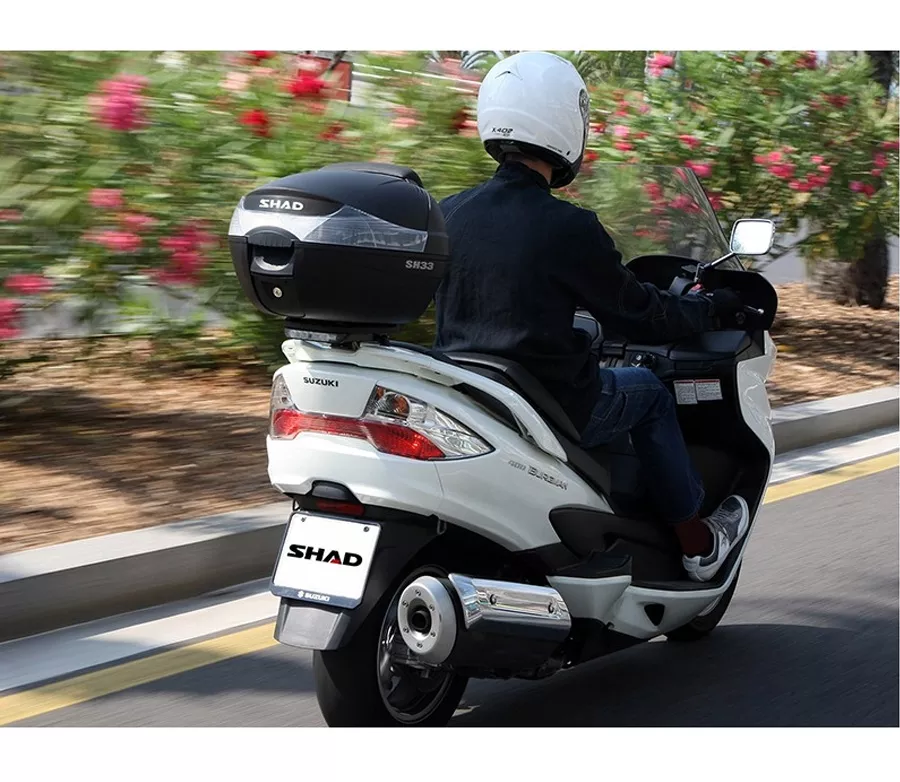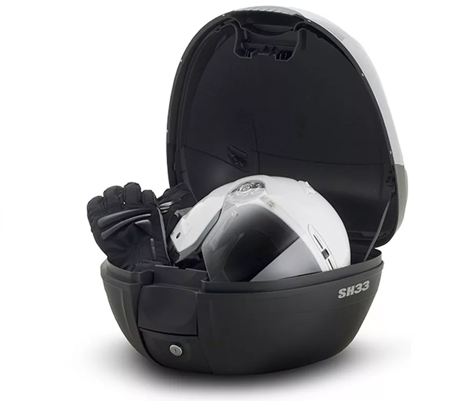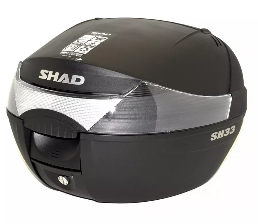 Kufr na moto a skůtr Shad SH33​. Plastový horní kufr vhodný na motocykl nebo skůtr Černá matná barva Nosnost: 3 kg Prostor pro 1 integrální helmu Vodotěsný Plotna pro připevnění je součástí balení Rozměry: Šířka: 43 / Výška: 31 / Hloubka: 42 Objem: 33l Je také možno dokoupit příslušenství: třetí brzdové světlo, barevné kryty, opěrka spolujezdce.