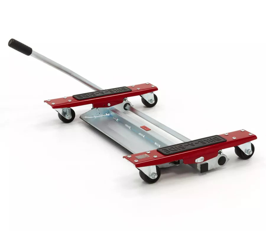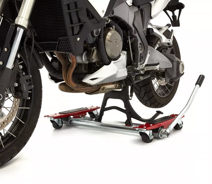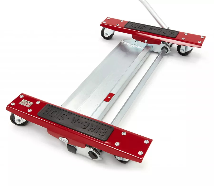 Servisní stojan Bike-a-Side od Acebikes je skvělým řešením pro pohodlnou manipulaci motocyklů se středovými stojany. Jednoduše postavte středový stojan motocyklu na servisní stojan Bike-a-Side a pomocí rukojeti snadno a kontrolovaně motocykl zvedněte. Poté můžete svou motorku bez námahy a bezpečně přesouvat. Tento pojízdný stojan na motorky se skvěle hodí pro manipulaci ve stísněných prostorech, jako je například garáž. Díky odolným kolečkům o průměru 65 mm s kuličkovými ložisky je servisní stojan Bike-A-Side velmi vhodný pro zvedání a přemisťování těžkých motocyklů do hmotnosti 450 kg. - Snadné zvedání a manipulace s motocyklem - Vysoce odolné a lehké materiály - Rukojeť pro snadné a kontrolovatelné zvedání a pokládání motocyklu - 4 vysoce odolná 65 mm kuličková ložiska - Navrženo pro motocykly se středovým stojanem do hmotnosti 450 kg - Materiál zvyšující tření pro bezpečné brždění na spodní straně stojanu - Použitelný bez nářadí - Váha: 16,5 kg - Rozměry: 49 x 85 x 10 cm - Nosnost: 450 kg