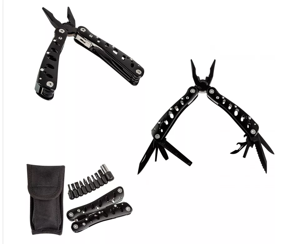 Kapesní multifunkční nářadí nezbytné pro drobné opravy doma i v přírodě. Pevná konstrukce je vyrobena z nerezové oceli s rukojetěmi z eloxovaného hliníku. Součástí je polyamidové pouzdro na opasek. Funkce: 1. kleště 2. štípací kleště 3. nůž s hladkým ostřím 6 cm 4. nůž s vlnitým ostřím 5 cm 5. pilník 6. malý a střední plochý šroubovák 7. otvírák lahví 8. otvírák konzerv 9. řezák 2,5 cm 10. držák bitů 11. 9-ks sada bitů: plochý 3 různé vel., křížový 3 různé vel., imbus č. 3, 4, 5 Parametry: Materiál: 420A nerezová ocel, eloxovaný hliník Barva: černá Hmotnost: 330 g Rozměr: 10,5 x 5,5 x 2,2 cm Rozměr po rozevření: 16,5 x 5,5 x 2,2,cm